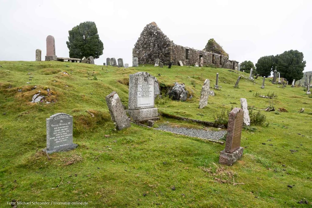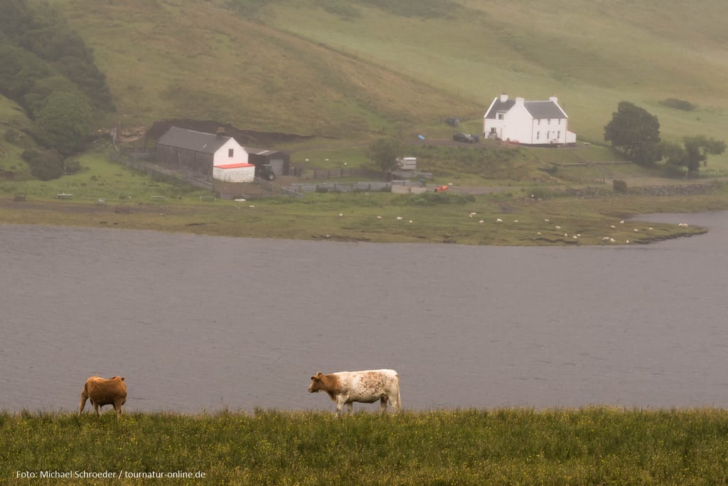 Am Fähranleger von Uig erkundigen wir uns nach einer Fährverbindung nach Harris, einer der äußeren Hebriden, Ein Übersetzen wäre erst in zwei Tagen möglich, eine Rückfahrt erst am Ende des Monats so gut gebucht sind die Fähren in der Hauptsaison. Ein Vorbuchen wäre ratsam gewsen. Wir setzen unsere Fahrt fort und verbringen den Abend in Portree, dem Hauptort der Insel. Bevor wir Skye am nächsten Morgen verlassen, machen wir noch einen kurzen Abstecher zum alten Fähranleger bei Kylerhea, da es hier zwei Beobachtungshütten für Otter gibt (ausgeschildet). Leider müssen wir feststellen, dass diese nur unter der Woche zugänglich sind und so macht und dies zusammen mit dem Wetter, dass die Landschaft in Nieselregen hüllt einen Strich durch die Rechnung.