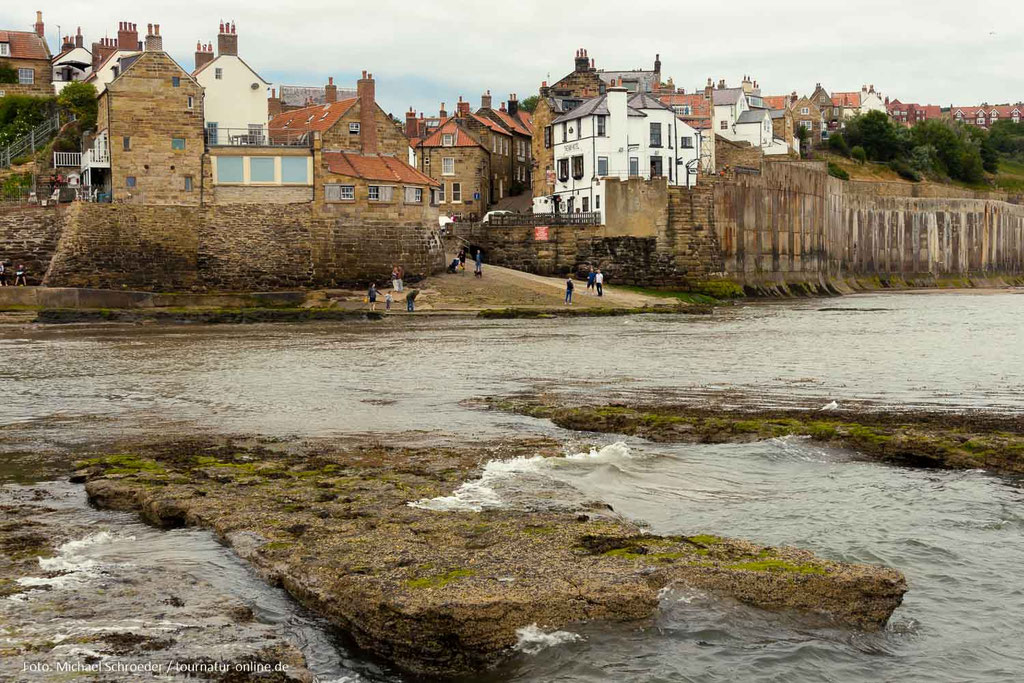 Wir fahren durch die zu blühen beginnende Heide zur Küste und hinunter in das ehemalige Piratennest Robin Hood's Bay. Obwohl stark auf Touristen ausgerichtet hat der Ort einen gewissen Charme und so parken wir unser Wohnmobil auf einem der kostenpflichtigen Parkplätze oberhalb des Orts und laufen über steile Treppen hinunter zum kleinen Hafen.