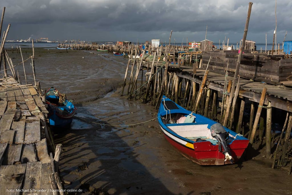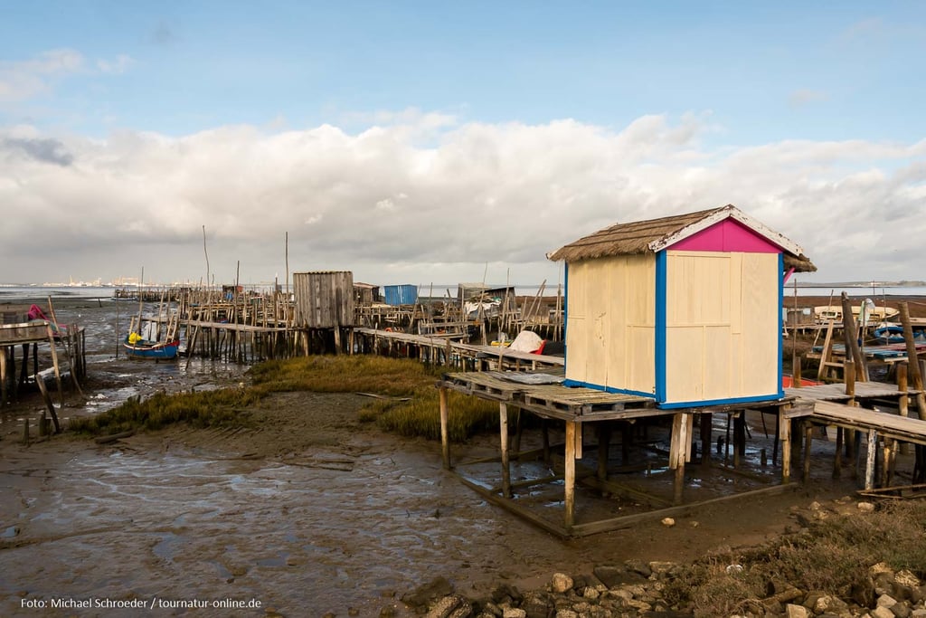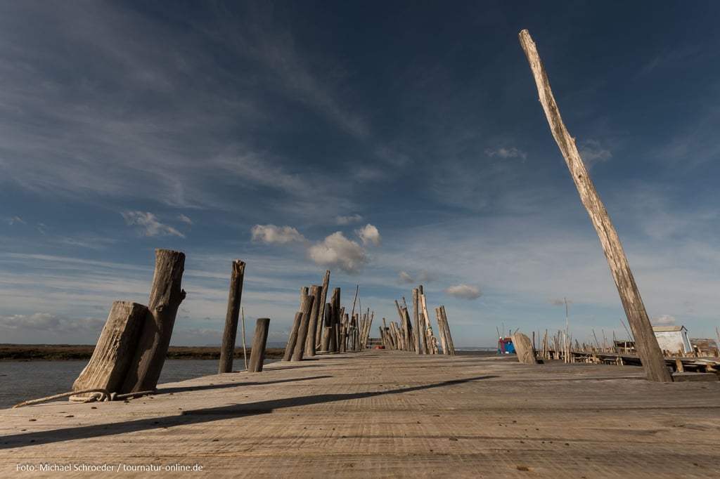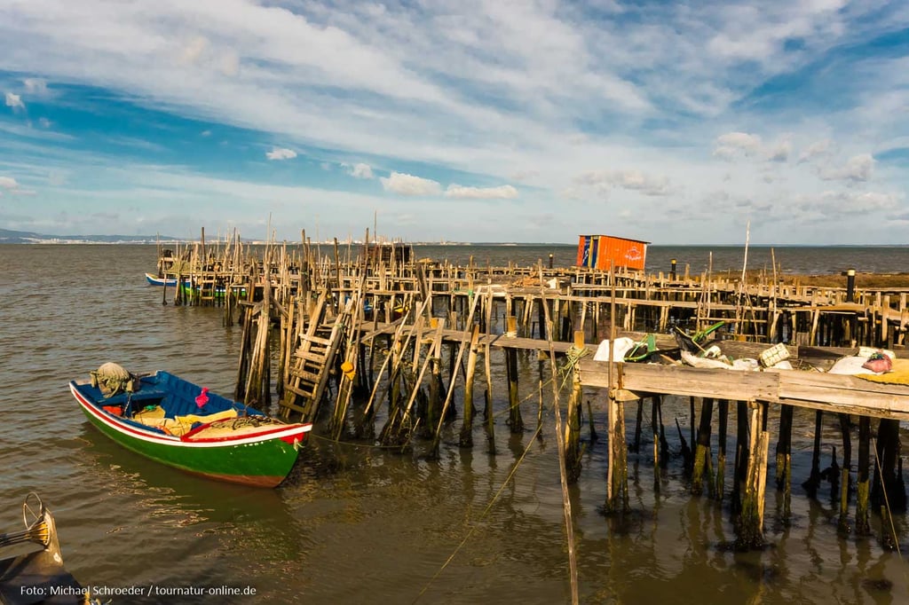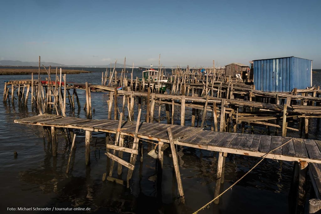 Errichtet in den 50er und 60er Jahren des letzten Jahrhundert erstrecken sich hier unweit des Ortes Carrasqueira Bootsstege auf Stelzen hinein in das schlammige Delta des Sado. Auch wenn der aus ungleichen Stangen und Brettern errichtete Steg mehr als wacklig wirkt, so ist er doch auch heute noch in Benutzung und bietet den Fischerbooten selbst bei niedrigem Wasserstand die Möglichkeit zum Anlegen. An den Stegen haben die Fischer aus Altholz kleine Hütten zur Aufbewahrung ihrer Ausrüstung und zur Verarbeitung der angelandeten Fische errichtet. Gerade dieses einfache und oft provisorische Ambiente macht die Anlage aus, die man erst auf den zweiten Blick als Sehenswürdigkeit wahr nimmt.