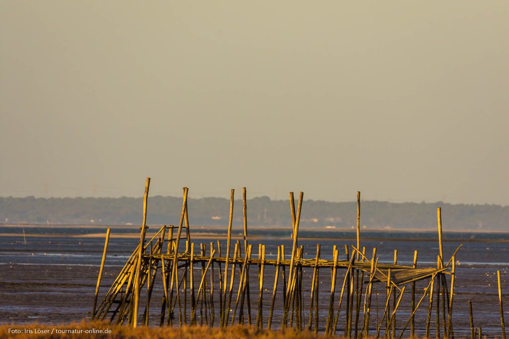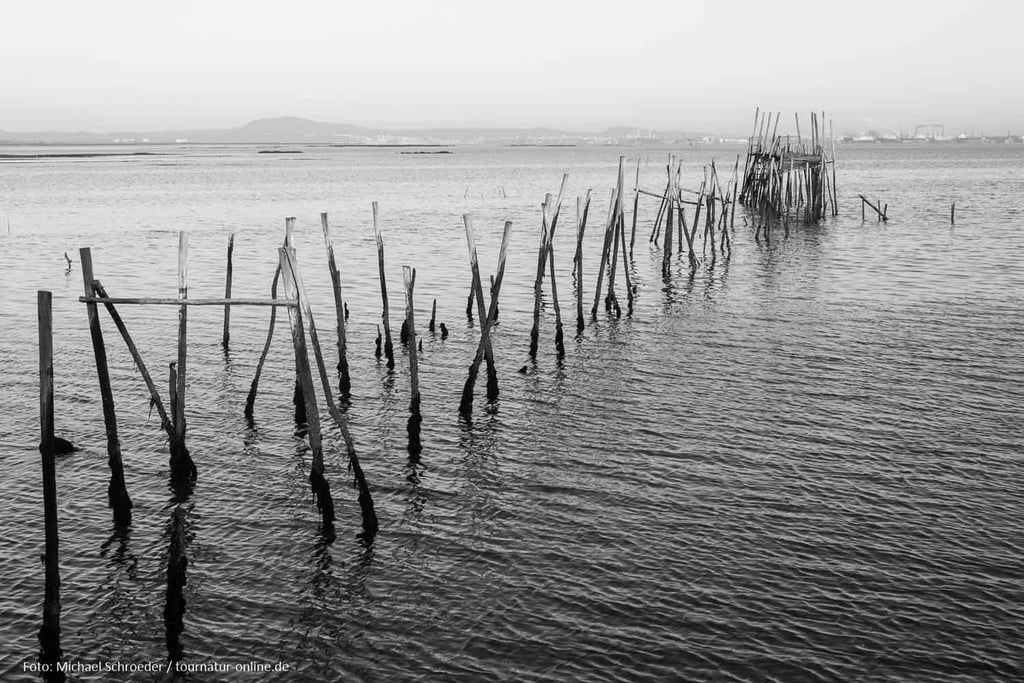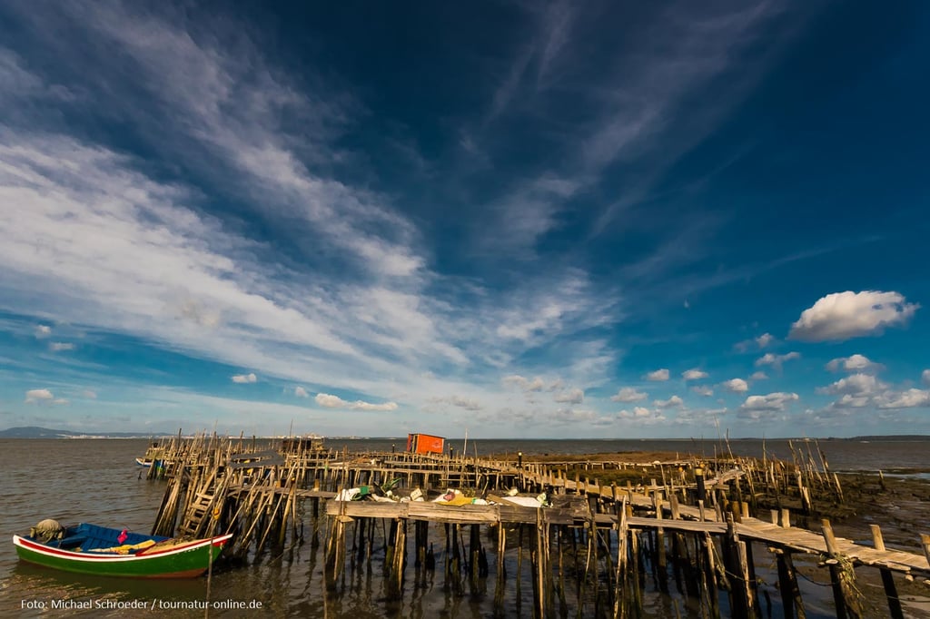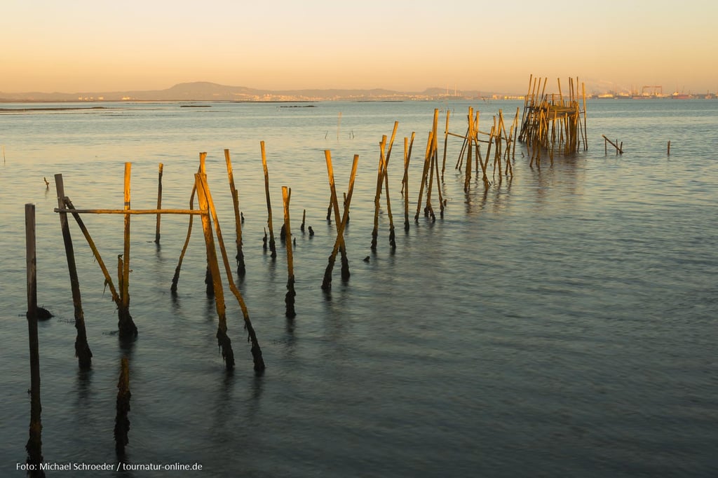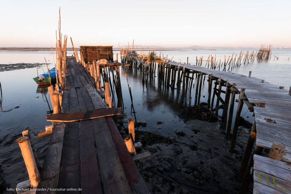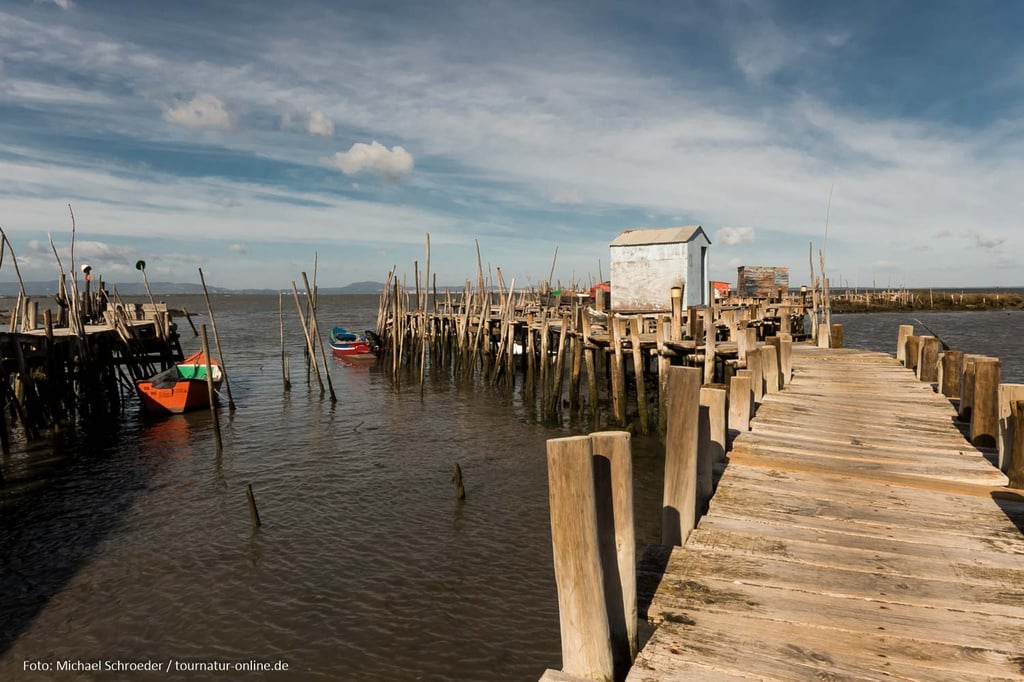 Errichtet in den 50er und 60er Jahren des letzten Jahrhundert erstrecken sich hier unweit des Ortes Carrasqueira Bootsstege auf Stelzen hinein in das schlammige Delta des Sado. Auch wenn der aus ungleichen Stangen und Brettern errichtete Steg mehr als wacklig wirkt, so ist er doch auch heute noch in Benutzung und bietet den Fischerbooten selbst bei niedrigem Wasserstand die Möglichkeit zum Anlegen. An den Stegen haben die Fischer aus Altholz kleine Hütten zur Aufbewahrung ihrer Ausrüstung und zur Verarbeitung der angelandeten Fische errichtet. Gerade dieses einfache und oft provisorische Ambiente macht die Anlage aus, die man erst auf den zweiten Blick als Sehenswürdigkeit wahr nimmt.