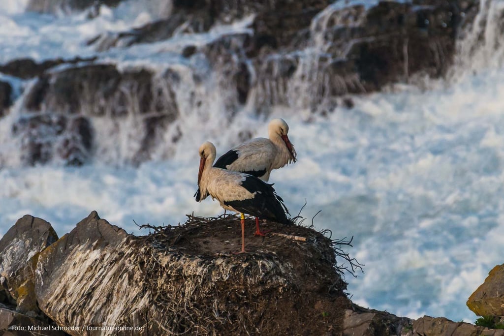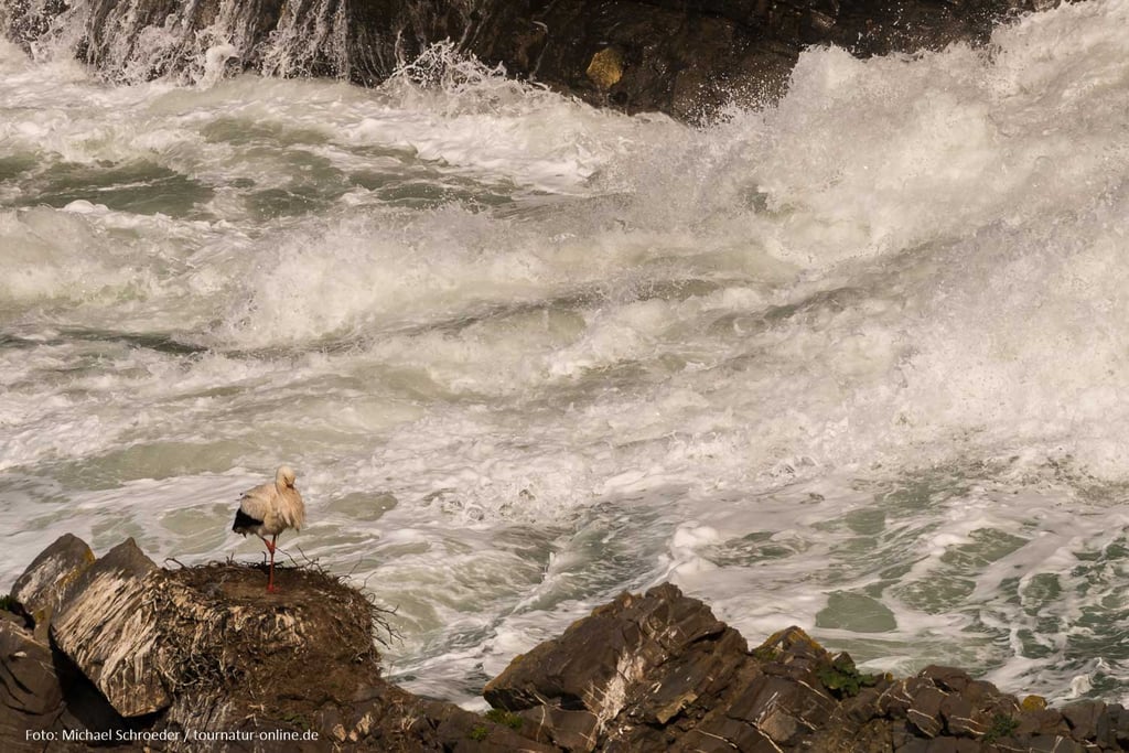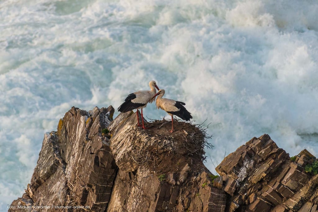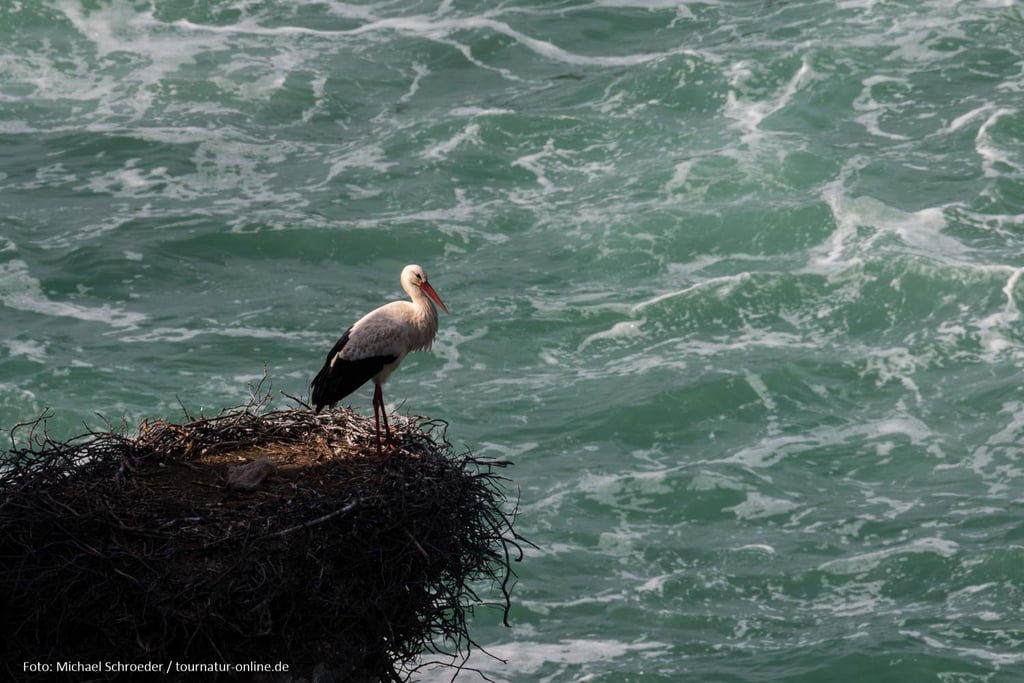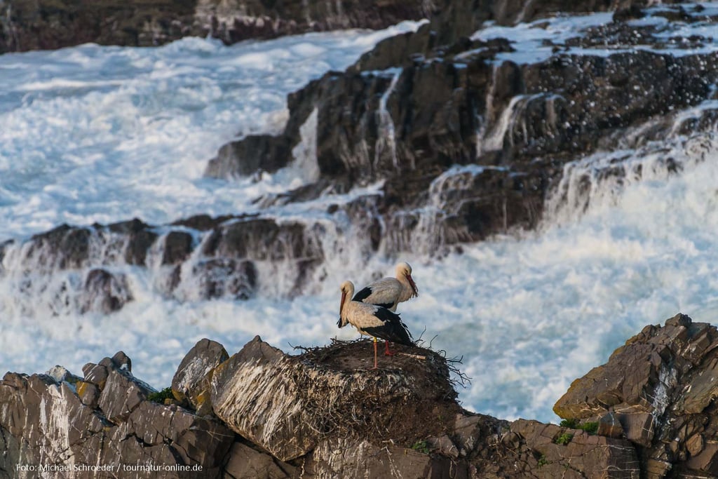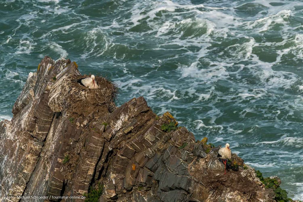 Üblicherweise bauen Störche ihre Nester auf Pfosten, Schornsteinen oder Giebeln. In Portugal aber, und auch nur hier, gibt es Störche, die in den Klippen nisten. Vom Parkplatz Cabo Sardao an der Westküste Portugals sind diese gut zugänglich. Die Störche vor tosender Brandung sind ein ungewohnter Anblick. Dass sie der Lärm nicht beim Klappern stört?