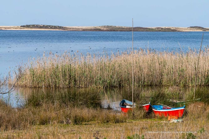 Wir fahren zuerst auf die Landzunge Richtung Troia auf der Meerseite der zentralen Laguna. Die Gegend entpuppt sich als sehr touristisch, denn sie liegt im Einzugsbereich sowohl von Setubal, der drittgrößten Stadt Portugals, als auch von Lissabon. Appartmentanlagen, Hotels, Golfplätze - um diese Jahreszeit in der Hauptsache verwaist - prägen das Bild. Es gibt eine Fähre von hier nach Setubal, die für unser Wohnmobil etwa 25 Euro kosten soll. Der Preis ist unabhängig davon, ob unser Auto 6 oder 10 Meter lang ist. Das finden wir bezogen auf das sonstige Preisgefüge in der Region etwas unverschämt.