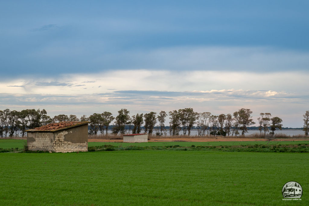 Wir folgen dem Küstenverlauf in Richtung Süden. Entlang der Straße wechseln sich kleine Badeorte und bäuerliche Betriebe ab, und wir passieren eine industrielle Saline.