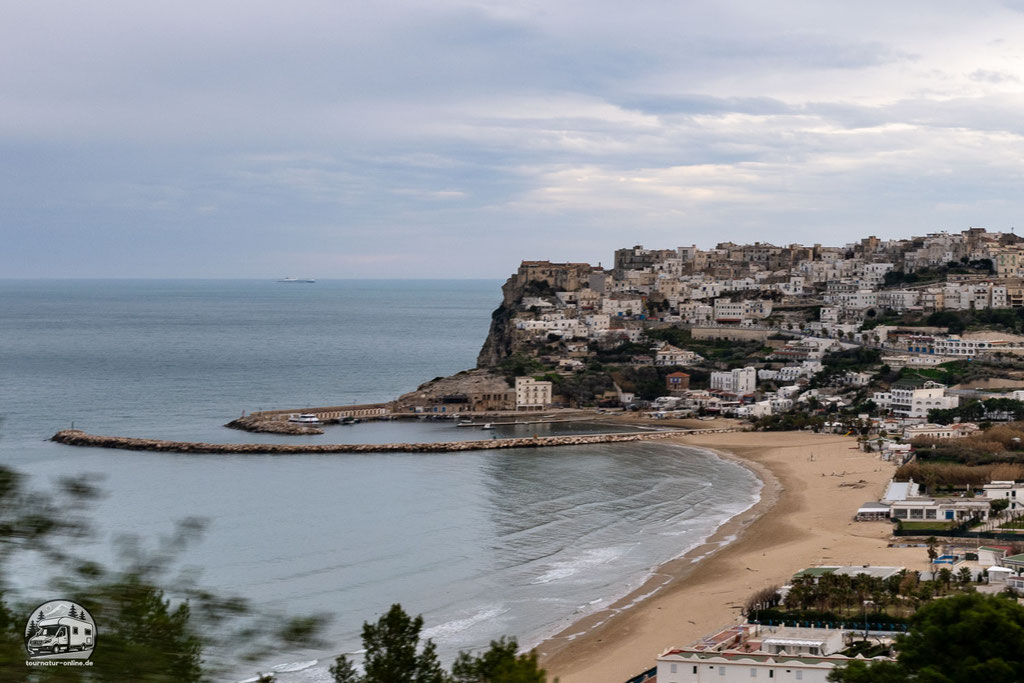 Am östlichen Ende des Stiefelsporns liegt die Kleinstadt Vieste. Hier drehen wir eine Runde durch den mittelalterlichen Ortskern der 14.000 Einwohner Stadt. Sowohl die Kirche Chiesa Rettoria di San Francesco als auch der Leuchtturm mit dem Hafen sind hübsche Fotomotive. Das eigentliche Wahrzeichen der Stadt ist aber der Pizzomunno, ein der Steilküste vorgelagerter weißer Monolith, der über den südlichen Stadtstrand zu wachen scheint.