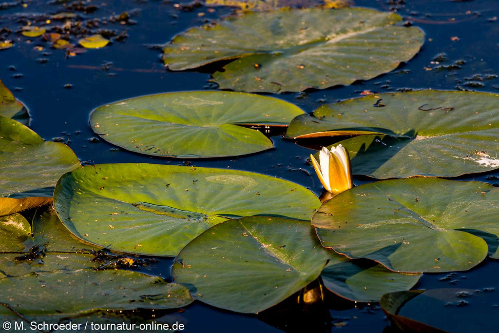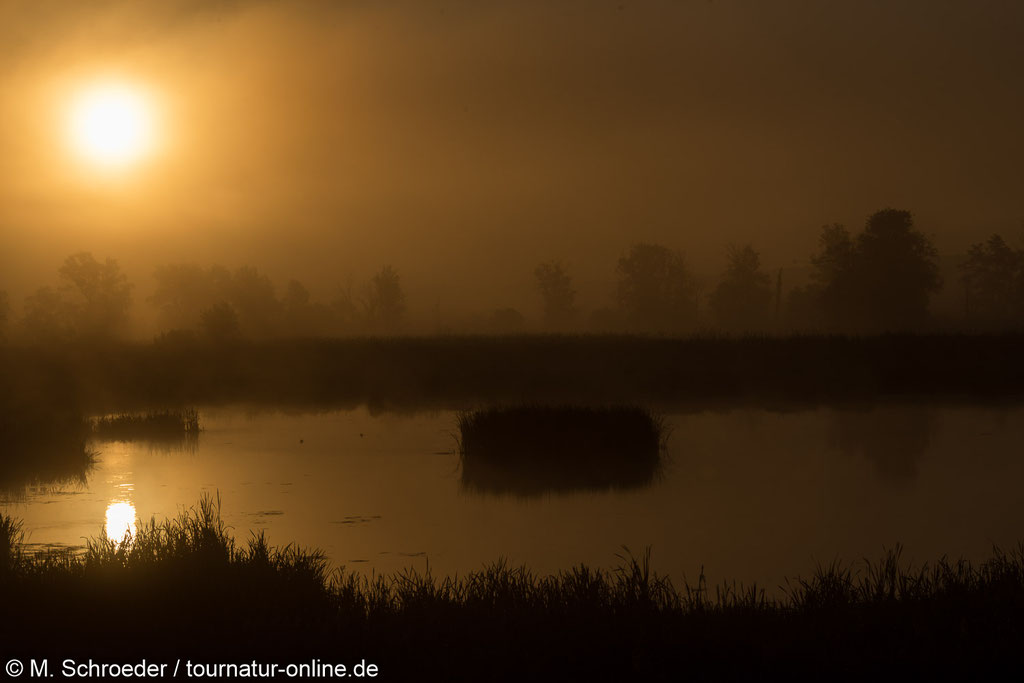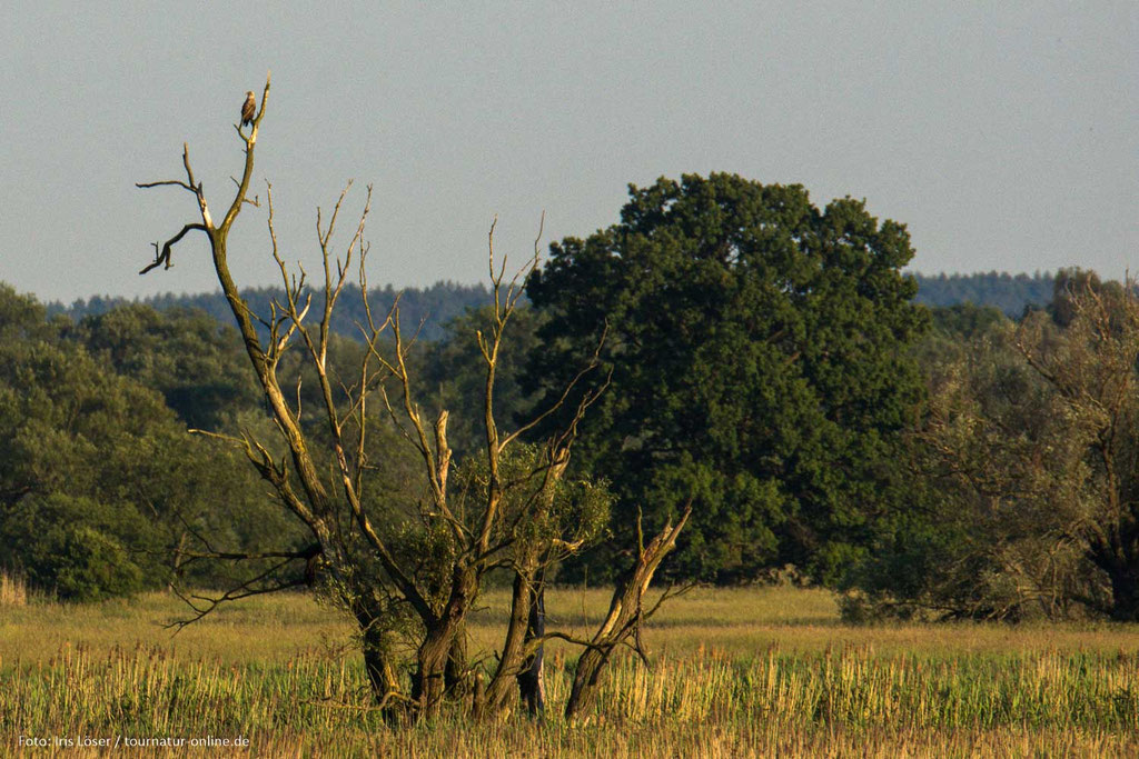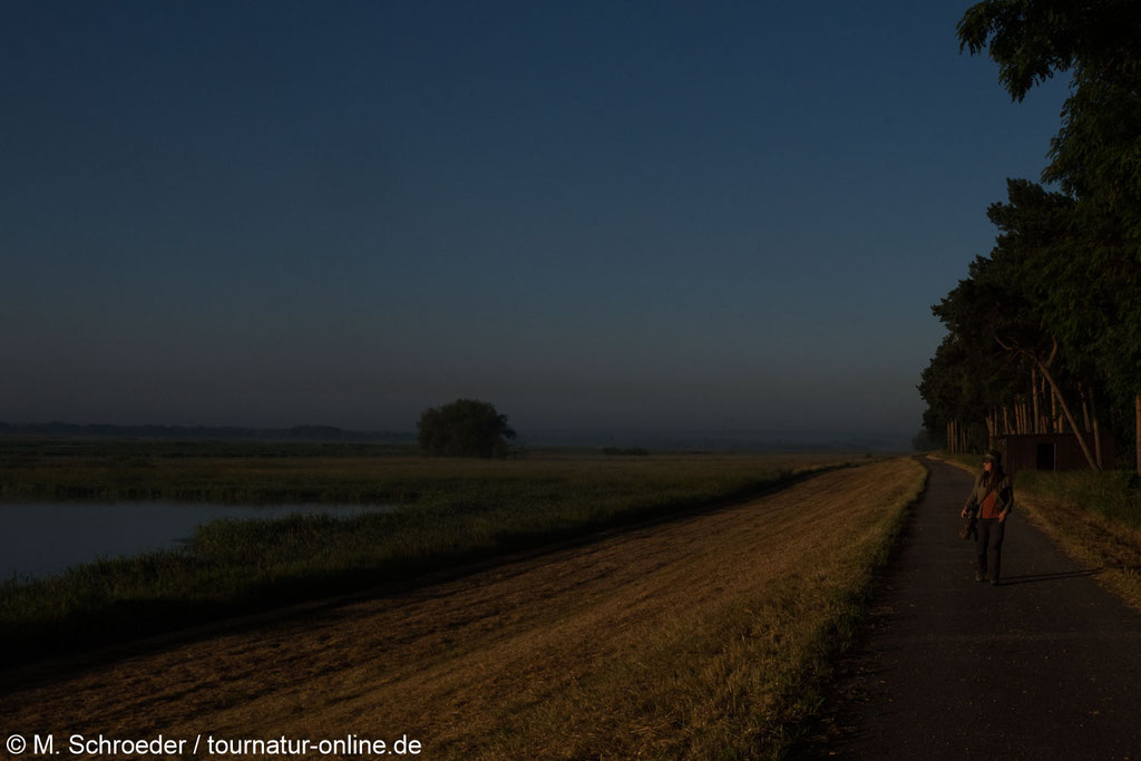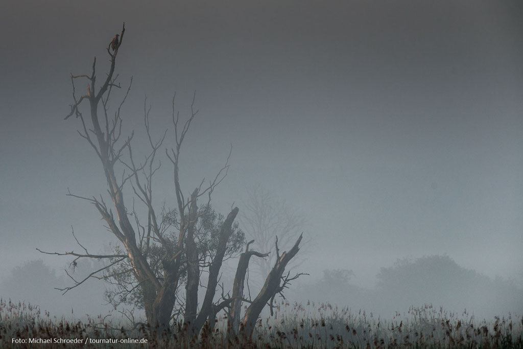 Besonders angetan hat es uns der Parkplatz in Grabow, von dem aus in wenigen Minuten eine Beobachtungshütte (ausgeschildert) zu erreichen ist und diverse Pfade direkt ins Herz der Feuchtgebiete führen. Nach einer ersten Erkundung am Abend, brechen wir am nächsten Morgen zu Sonnenaufgang erneut auf und werden mit fast mystisch anmutenden Bildern belohnt. Neben dem Seeadler sehen wir unter anderem Kraniche, viele Singvögel (darunter Neuntöter) und diverse Libellen.