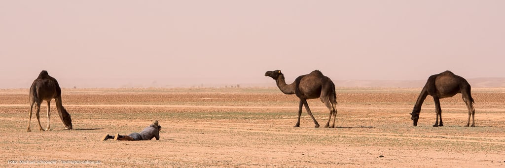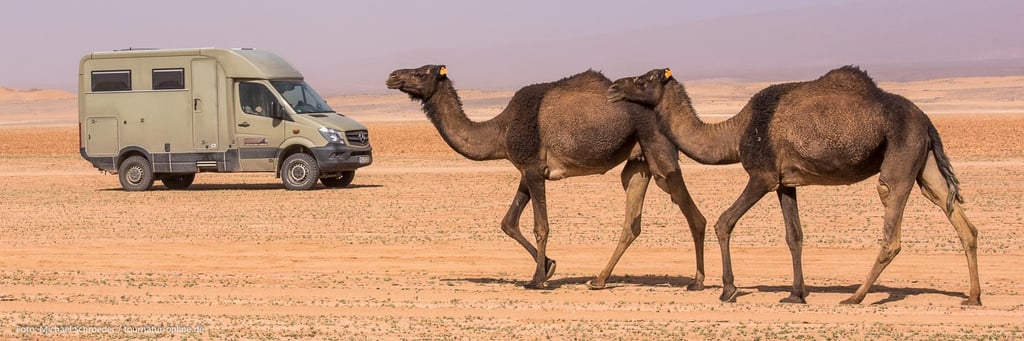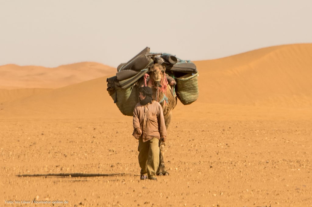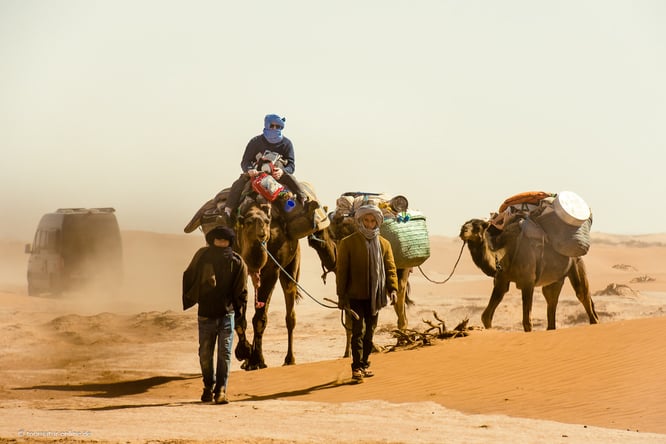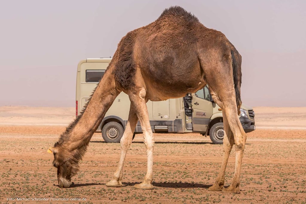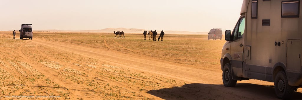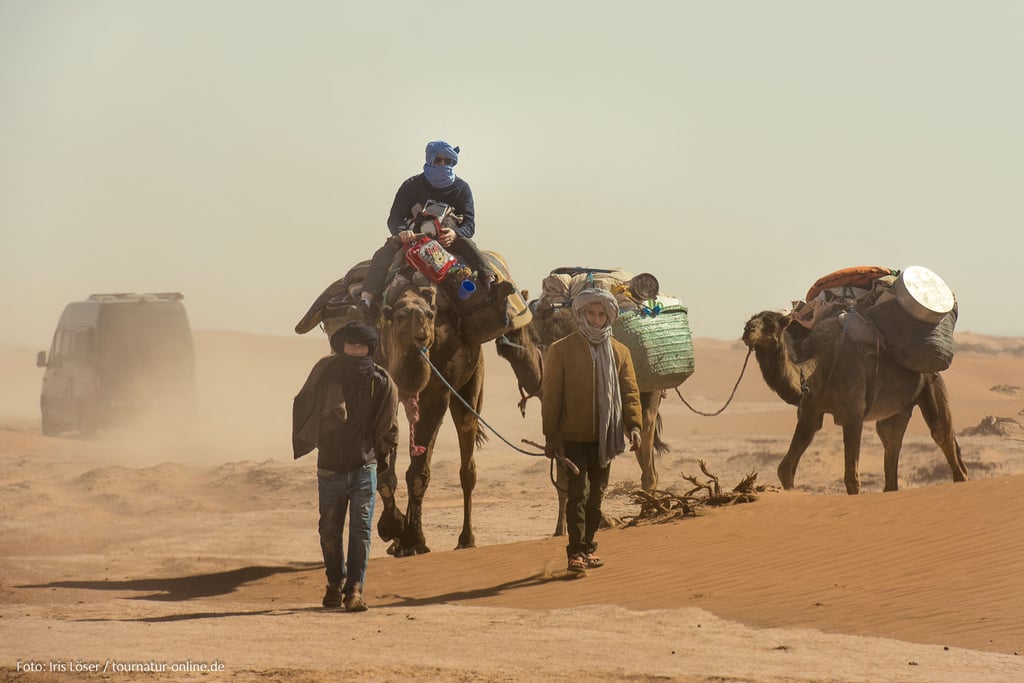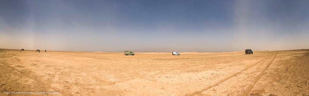Um so näher wir unserem Ziel, der kleinen Stadt M'hamid, kommen, um so häufiger treffen wir nun auf Oasen, Nomaden mit ihren Kamelen und kleine Siedlungen mitten in der Wüste. Hier gäbe es auch die Möglichkeit in einem Camp noch eine weitere Nacht zu verbringen. Da aber immer mehr Sand in der Luft ist, verzichten wir darauf, denn einen Sandsturm in der Wüste zu erleben, ist kein Spaß. Das wollen wir weder und schon garnicht unseren Autos zumuten. In M'hamid endet die Piste und wir fahren auf einen Campingplatz, wo wir uns und unseren Fahrzeugen nach der anstrengenden Fahrt etwas Ruhe und Pflege gönnen wollen.