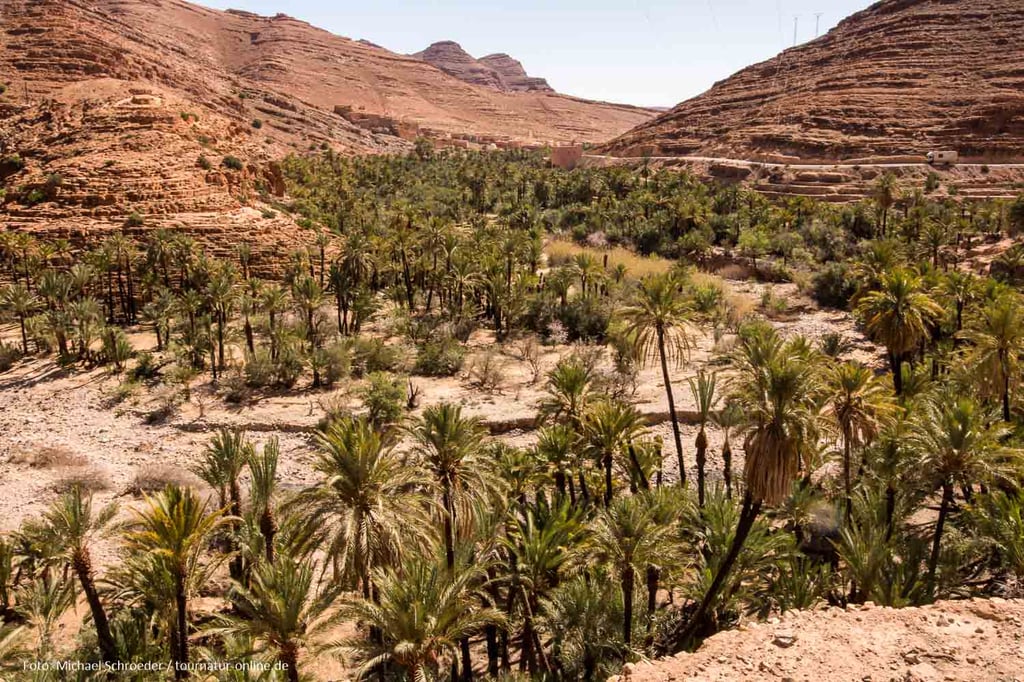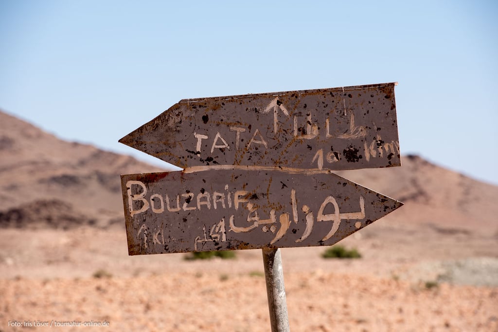 Wir befinden uns jetzt in den Ausläufern des Antiatlas-Gebirges. Auf unserem Weg nach Osten kommen wir immer wieder an Oasen mit Palmen und wasserführenden Flüssen vorbei, die sich extrem von der unwirtlichen Steinwüste abheben. In Tata, einer Oasenstadt mit etwa 20.000 Einwohnern legen wir einen Zwischenstopp ein.