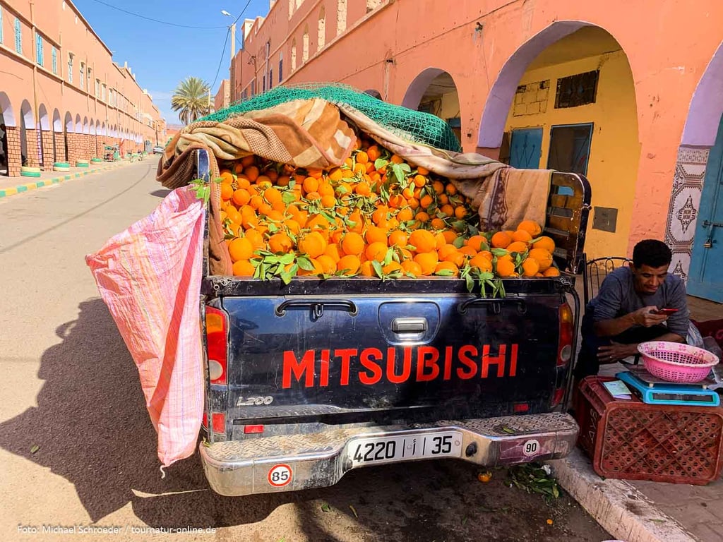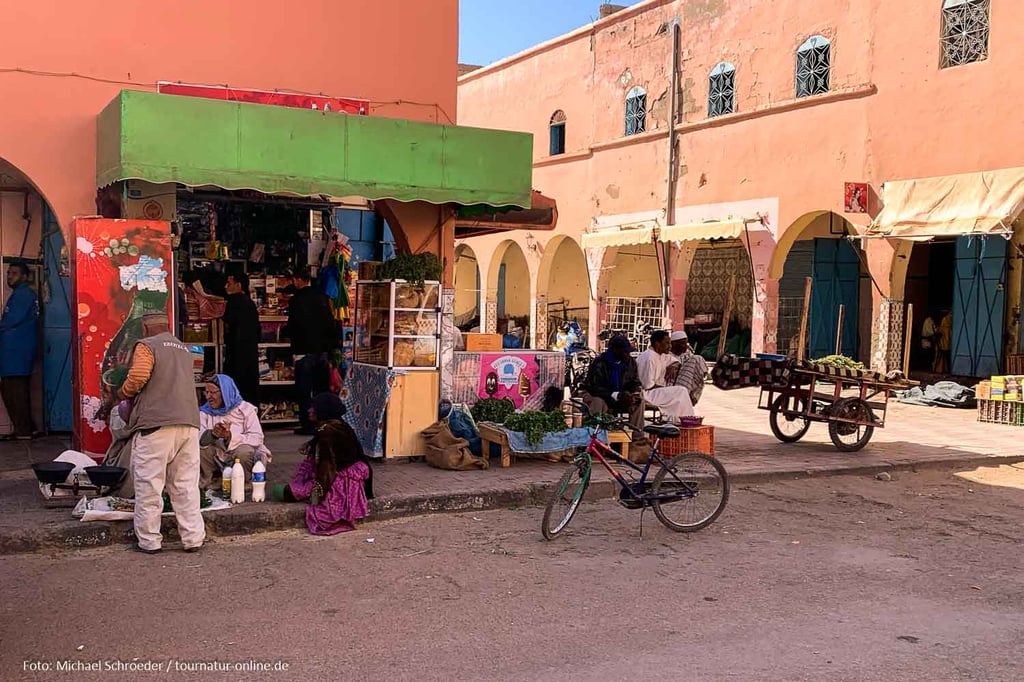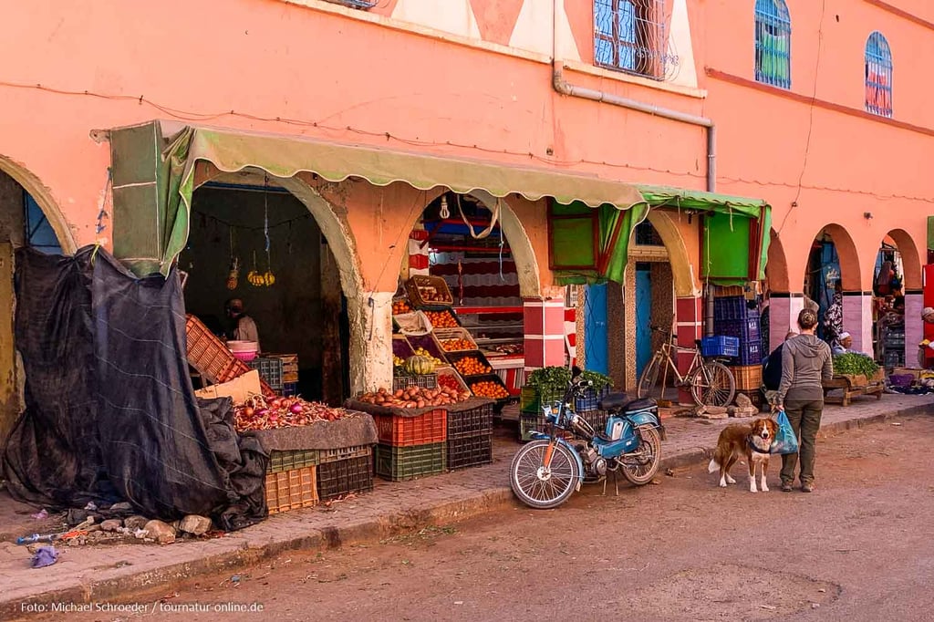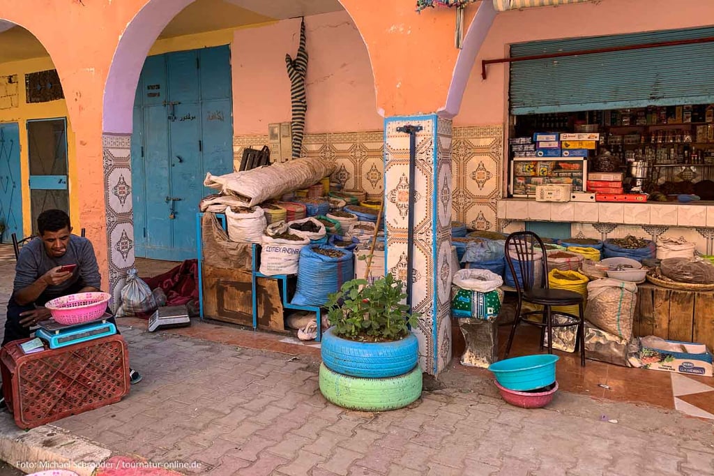 Außerhalb von Suppermärkten Einkaufen zu gehen ist in Marokko für uns Europäer immer wieder ein Erlebnis. Das Gemüse ist super frisch und lecker und man kann immer selbst auswählen, was man möchte. Beim Bäcker zeigt man am Besten auf die Dinge, die man haben möchte. In Tata gibt es sogar einen richtigen Konditor mit feinen Kuchen und Gebäck. Die Metzgereien aber präsentieren ihre Auslagen dem potentiellen Kunden meist ungekühlt VOR und ÜBER der Theke. Ein frischer Kuhkopf zeigt, dass die gezeigten Produkte auch wirklich frisch sind. Gewöhnungsbedürftig. Wasser kaufen wir mittlerweile meist im 5l-Kanister. Das spart Platz und Plastikabfall - von diesem gibt es hier ohnehin zu viel.