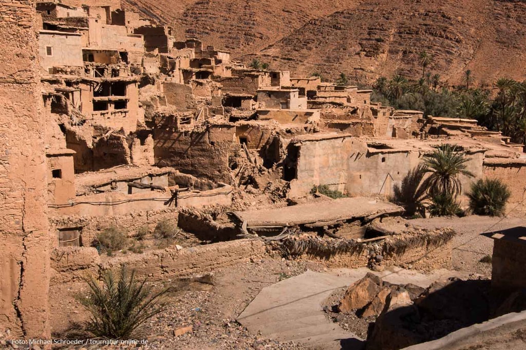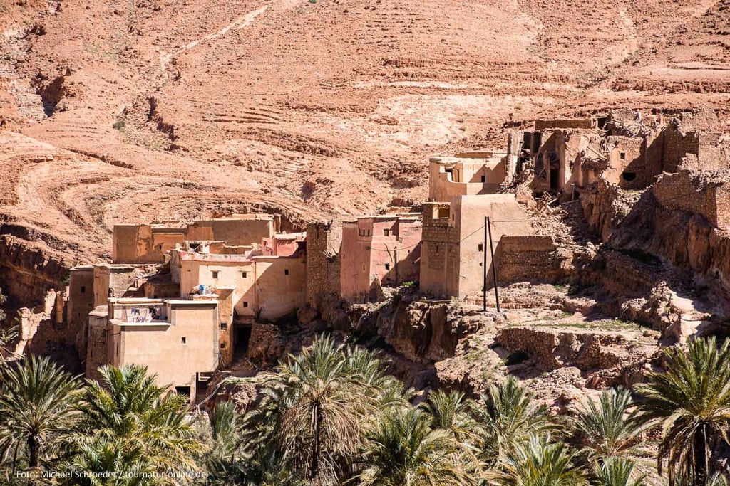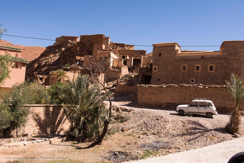 Das grüne Tal von Aït Mansour mit seinen vielen Palmen gesäumt von hohen Felswänden ist eng, die Straße durch die kleinen Ortschaften für uns aber gut befahrbar. Am Straßenrand gibt es kleine Hotels und Lokale, teilweise stehen die Stühle und Tische auf der an sch schon schmalen Straße so dass es noch enger wird. Mit einem LKW wollten wir uns hier allerdings nicht durchschlängeln müssen. Wieder einmal sind wir froh, dass unser Wohnmobil nur 2 m breit bzw. schmal ist.