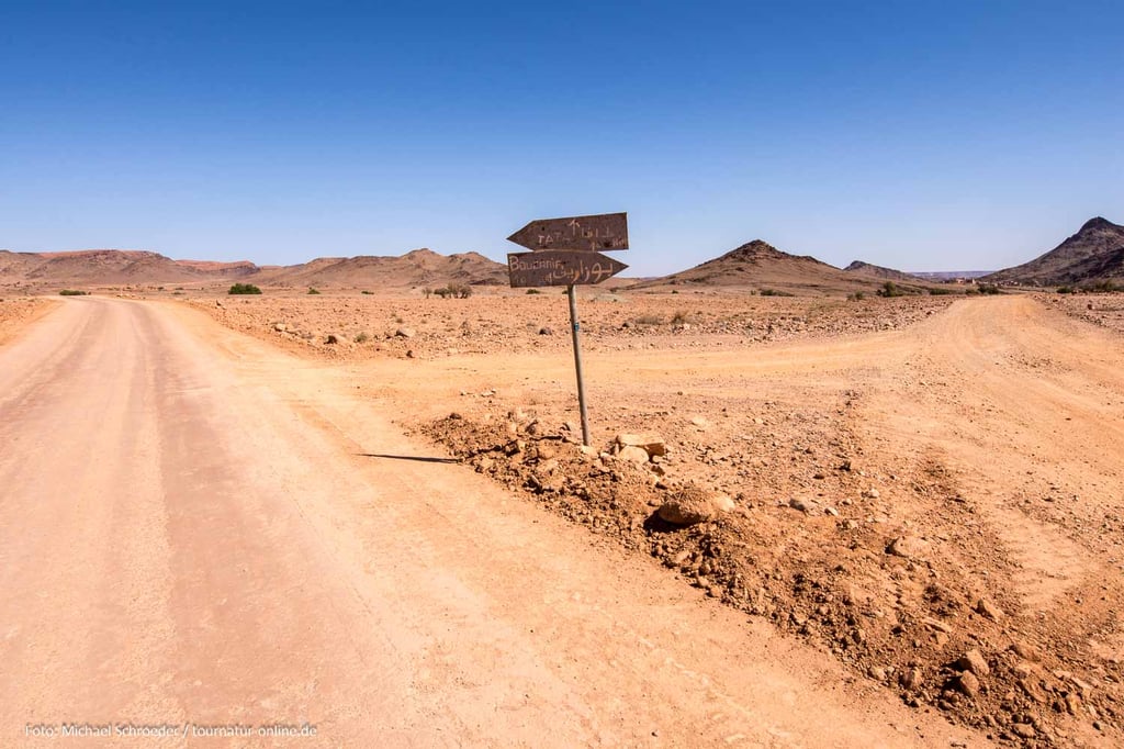 Die folgende unbefestigte Strecke ist auf unserer Straßenkarte nicht eingezeichnet. Wir versuchen es trotzdem und finden dank unserer offline Karte von Maps.me und gutem Riecher letztlich den Einstieg in die Piste. Diese wird auch von LKWs einer Mine genutzt und fährt sich bei dem derzeit trockenen Wetter wie fast wie eine Autobahn. Die Beschilderung entspricht nicht ganz europäischem Standard, aber wir finden uns zurecht. (siehe Bild unten - nein, wir sind nicht auf dem Markt für Kunsthandwerk, das ist ernst gemeint). Für uns fühlt sich diese Fahrt jedenfalls an wie ein erstes Abenteuer.