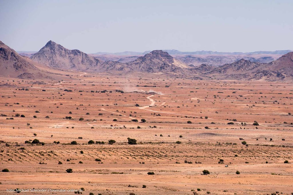 Unser Weg führt uns nun mitten durch die Wüste. Die harte Piste ist gut befahrbar, den ganz großen Steinen kann man gut ausweichen. Weiter westlich verändert sich die Landschaft, die ersten Sanddünen tauchen auf. Dazwischen immer wieder komplett ebene Flächen und ab und an sogar etwas Grün, das vor der sonst erdfarbenen Kulisse fast unnatürlich wirkt. Auf hartem Untergrund düsen wir manchmal mit 80 Stundenkilometern durch die Weite.