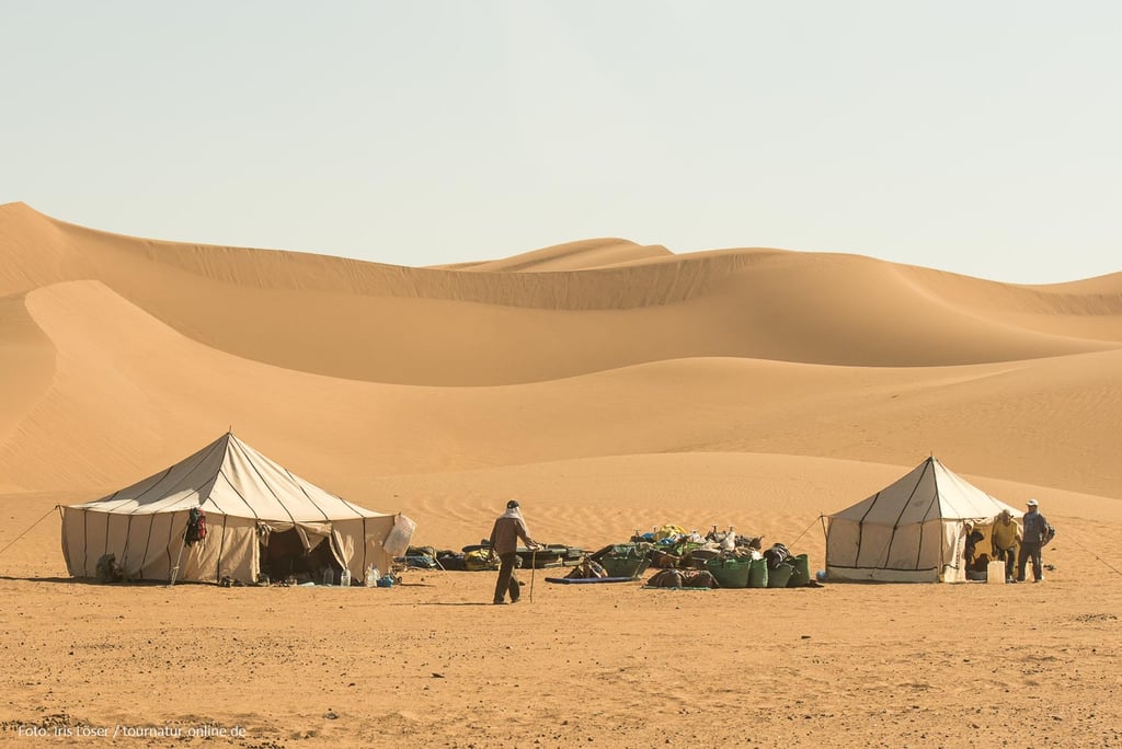 Gegen Abend schlagen wir abseits der uns am ersten Tag meist durch karge Steinwüste führenden Piste unser Lager auf. Wir genießen den Abend und backen Pfannenpizza (hier das: Rezept) . Kein Mensch weit und breit, über uns spannt sich der endlose Sternenhimmel, nur das Lagerfeuer verbreitet etwas Wärme. Bei dem Gedanken daran, dass in nur knapp 50 km Entfernung die Grenze zu Algerien liegt, könnte allerdings kurz ein mulmiges Gefühl aufkommen.