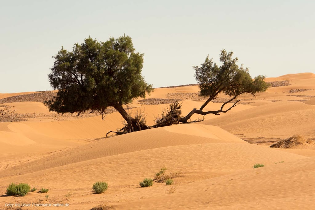 Wer die Wüste Erg Chegaga durchquert hat, für den bedeutet der Ort M'hamid das Ende einer langen Off-road-Tour über Steinpisten und Dünen. Mensch und Technik haben einiges hinter sich und so sind die ersten Palmen des Ortes auch für uns nach 2 Tagen im Nichts und über 150 Wüsten-Kilometern ein echter Lichtblick.