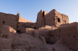 Michael und Phil erkunden die alten, fast unbewohnten und im Verfall begriffenen Lehmbauten zusammen mit Rudi im Rahmen eines Morgenspaziergangs.