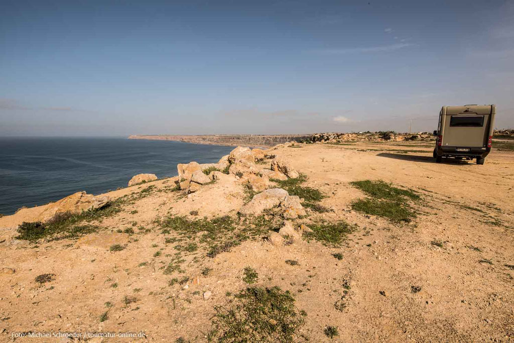 Unser erster Halt ist der Strand von Moulay Bouzerktoun. Auf dem kleinen Parkplatz neben der Polizeistation des kleinen Ortes wird freies Stehen mit dem Wohnmobil zumindest im Winter geduldet. Man steht leicht erhöht auf Schotter und hat einen fantastischen Blick auf die Küste und den Atlantik. Abends kommt ein Polizist vorbei und nimmt die Personalien der Reisenden auf. Akribisch werden alle unsere Daten notiert - und das nicht nur am ersten, sondern auch an jedem weiteren Tag.