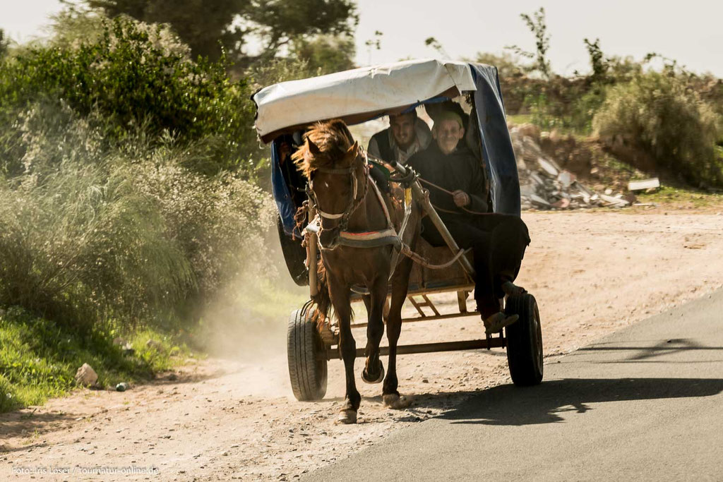 In der Umgebung von Tanger wird viel gebaut, die Landschaft ist überraschend grün. Auf den Straßen sieht man um die Mittagszeit viele Menschen, hauptsächlich Männer. Die meisten Frauen sind locker verschleiert, man sieht aber auch europäisch angezogene Frauen, mit offenen Haaren, die nicht den Eindruck erwecken, Touristen zu sein und vereinzelt eine Burka.