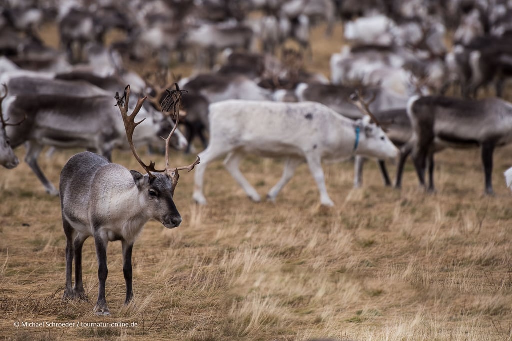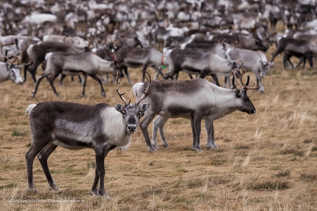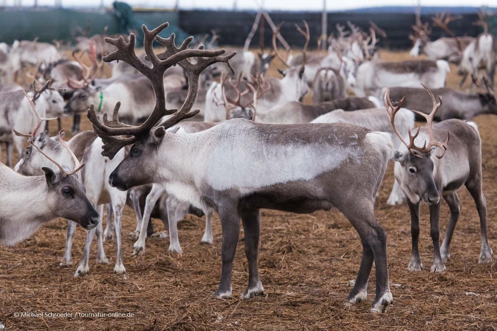 Einer Eingebung folgend – das ist etwas übertrieben, denn eigentlich sind wir nur auf der Suche nach einem Platz für Mittagspause und Hunderunde – machen wir einen kurzen Schlenker in eine parallel zur Hauptstraße führende Nebenstraße. Hier stehen wir gänzlich unverhofft inmitten von Menschen, die neben der Straße eine wahrlich riesige Rentierherde in ein Gatter treiben.