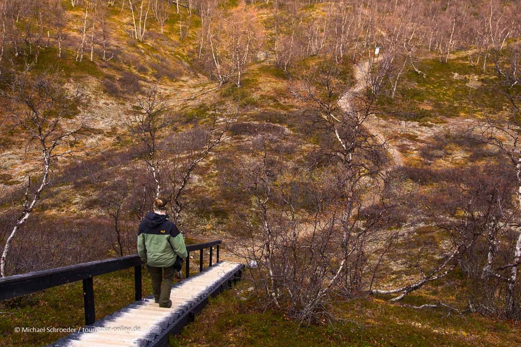 Von unserem Parkplatz aus starten wir zu einer kleinen Wanderung entlang eines Rundwegs. Dieser führt uns über steile Anstiege, die mit Treppen einfacher begehbar gemacht wurden, in diese ursprüngliche Landschaft mit ihren extremen Lebensbedingungen. Hier geht im Sommer die Sonne an 66 Tagen (20.5. - 24.7.) nicht unter und die Temperatur kann auf über 30°C ansteigen. Im Winter kann es während der 56 Tage 825.11. - 19.1.) dauernden Polarnacht bis zu -40°Grad kalt werden. Unterwegs sehen wir einen bunten Seidenschwanz und können eine Wasseramsel bei der Futtersuche im Wasser beobachten. Weitere beschilderte Wasserwege führen noch tiefer ins Gebiet.