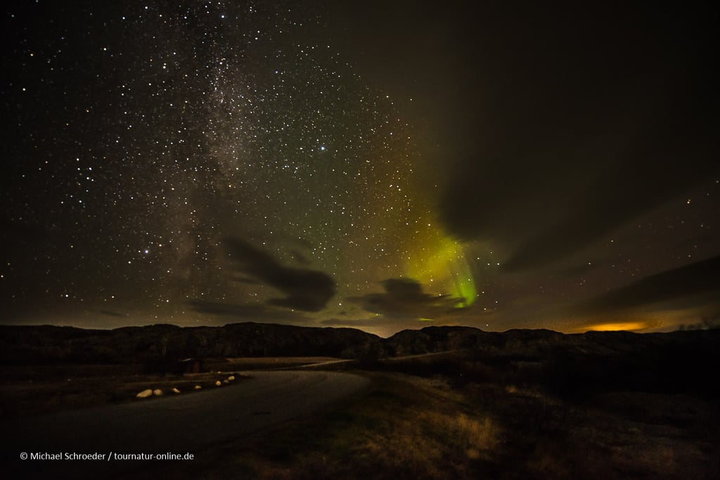 In weitem Umkreis befindet sich keine menschliche Siedlung , die Sicht durch sogenannte Lichtverschmutzung beeinträchtigt könnte. Selbst der Mond zeigt sich nur mit einer schmalen Sichel. Es ist wirklich stockdunkel. So tanzen am Nachthimmel nicht nur die Polarlichter, auch das Band der Milchstraße ist eindrucksvoll zu sehen. Temperaturen um den Gefrierpunkt und eisige Wind sind vergessen, so sehr begeistert uns das Schauspiel über uns.