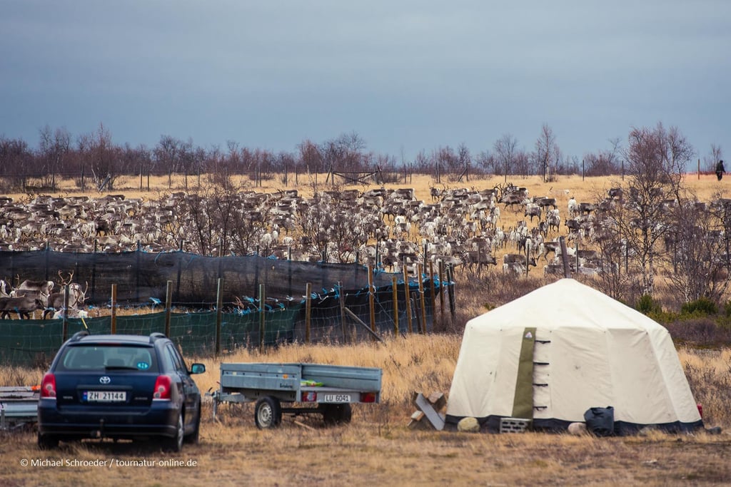 Wir halten an und bestaunen das Gewimmel von Tieren. Zu unserer Überraschung stoßen die Rentiere grunzende Laute aus, die uns eher an Schweine oder vielleicht wage an in der Brunft erinnern. Vor den Gattern sind jurtenähnliche Zelte aufgebaut.