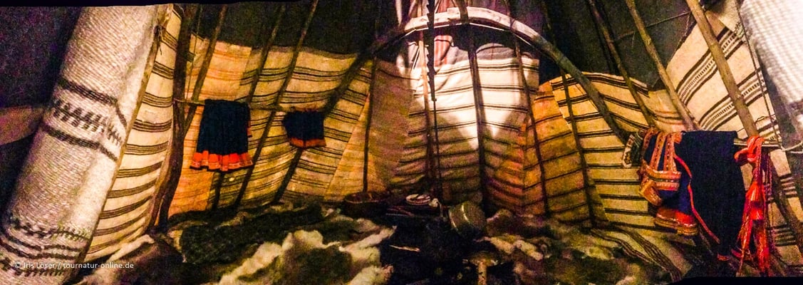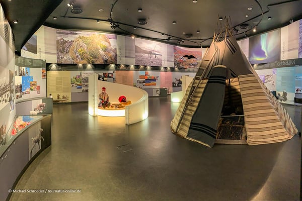 Es werden hier Kleidungsstücke und Alltagsgegenstände gezeigt. Auch eine Kote, eine typische samische Behausung, gezeigt, die uns an ein Tippi der amerikansichen Ureinwohner denken lässt. Eine kleine Ausstellung zeigt darüber hinaus Stücke zu Vogelwelt und Natur der Region. Hier erfahren wir, dass es in Lappland nicht 4 sondern 8 Jahreszeiten gibt.