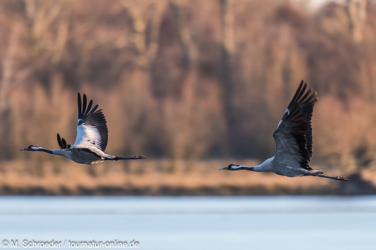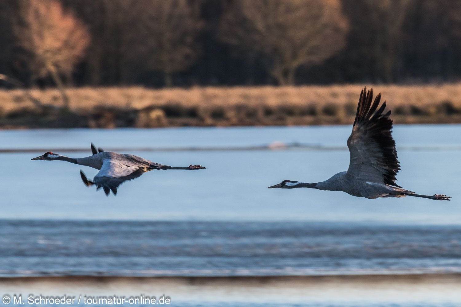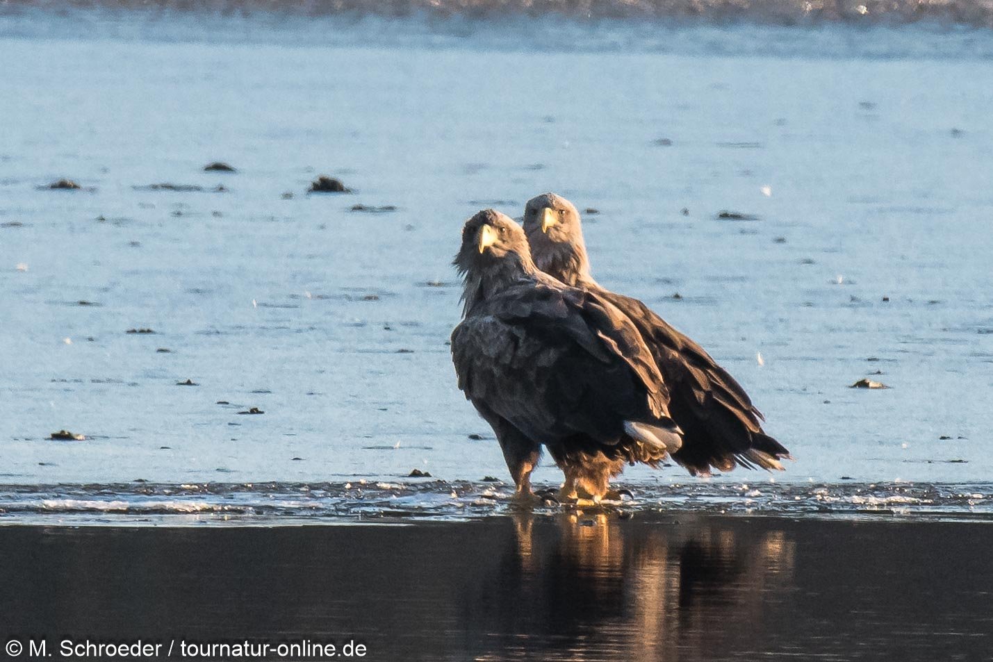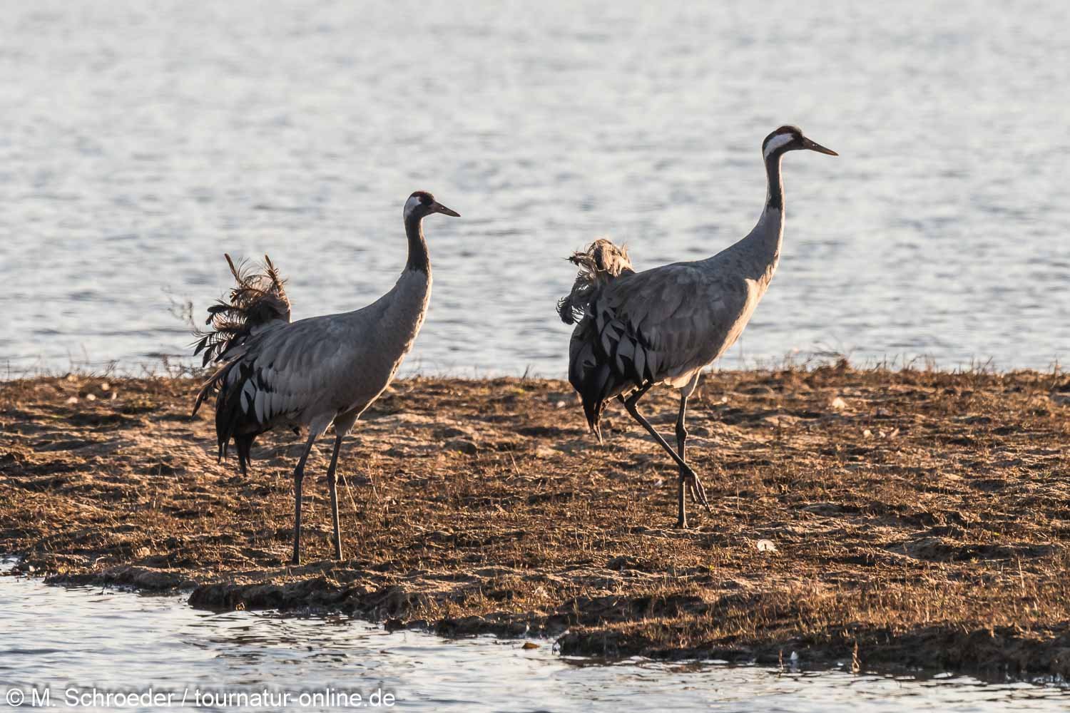 Nach kurzer Zeit wissen wir auch warum: Zum Greifen nah stehen hier überwinternde Kranichpaare im seichten Wasser. Auf der Eisfläche des Sees balzen Seeadler umgeben von diversen Entenvögeln.