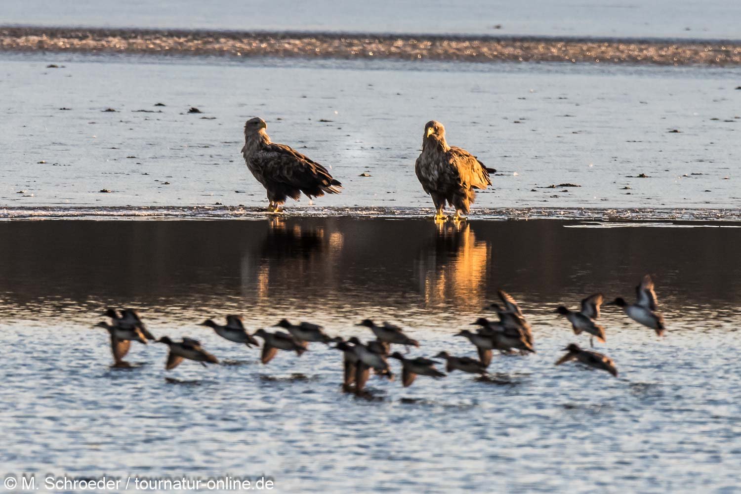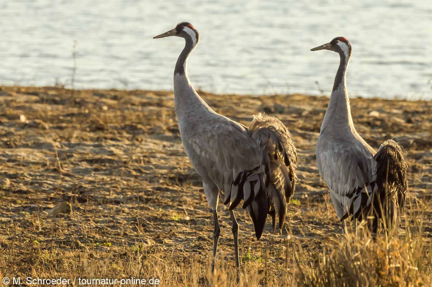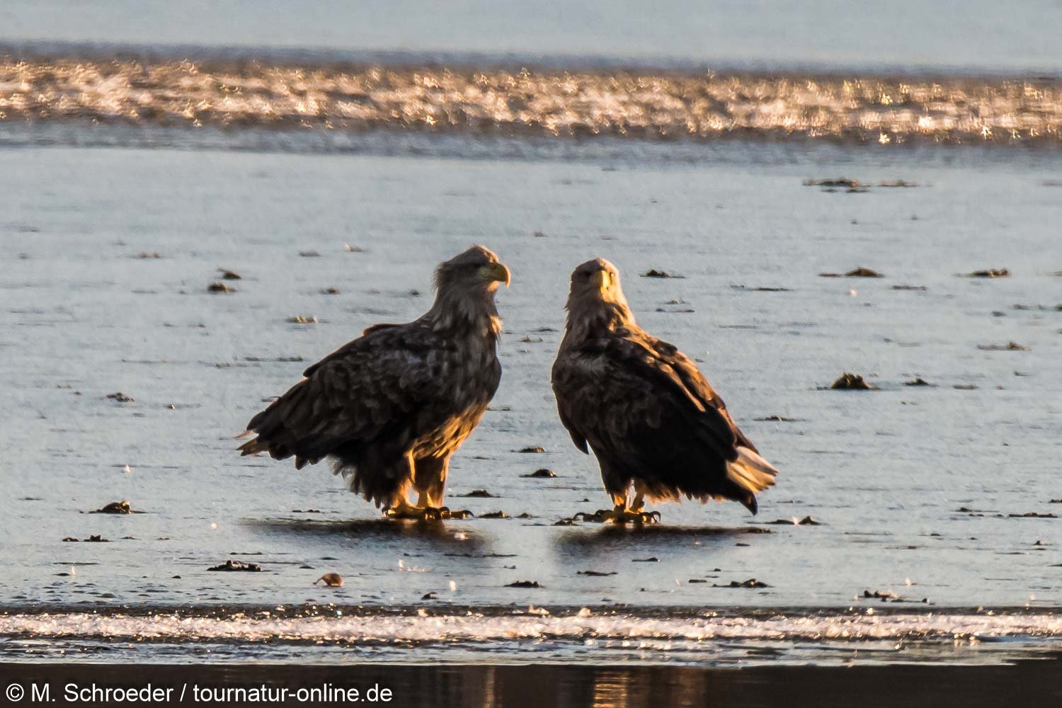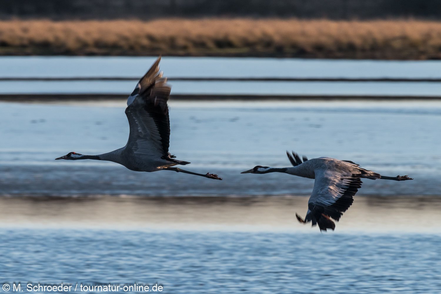 Nach kurzer Zeit wissen wir auch warum: Zum Greifen nah stehen hier überwinternde Kranichpaare im seichten Wasser. Auf der Eisfläche des Sees balzen Seeadler umgeben von diversen Entenvögeln.
