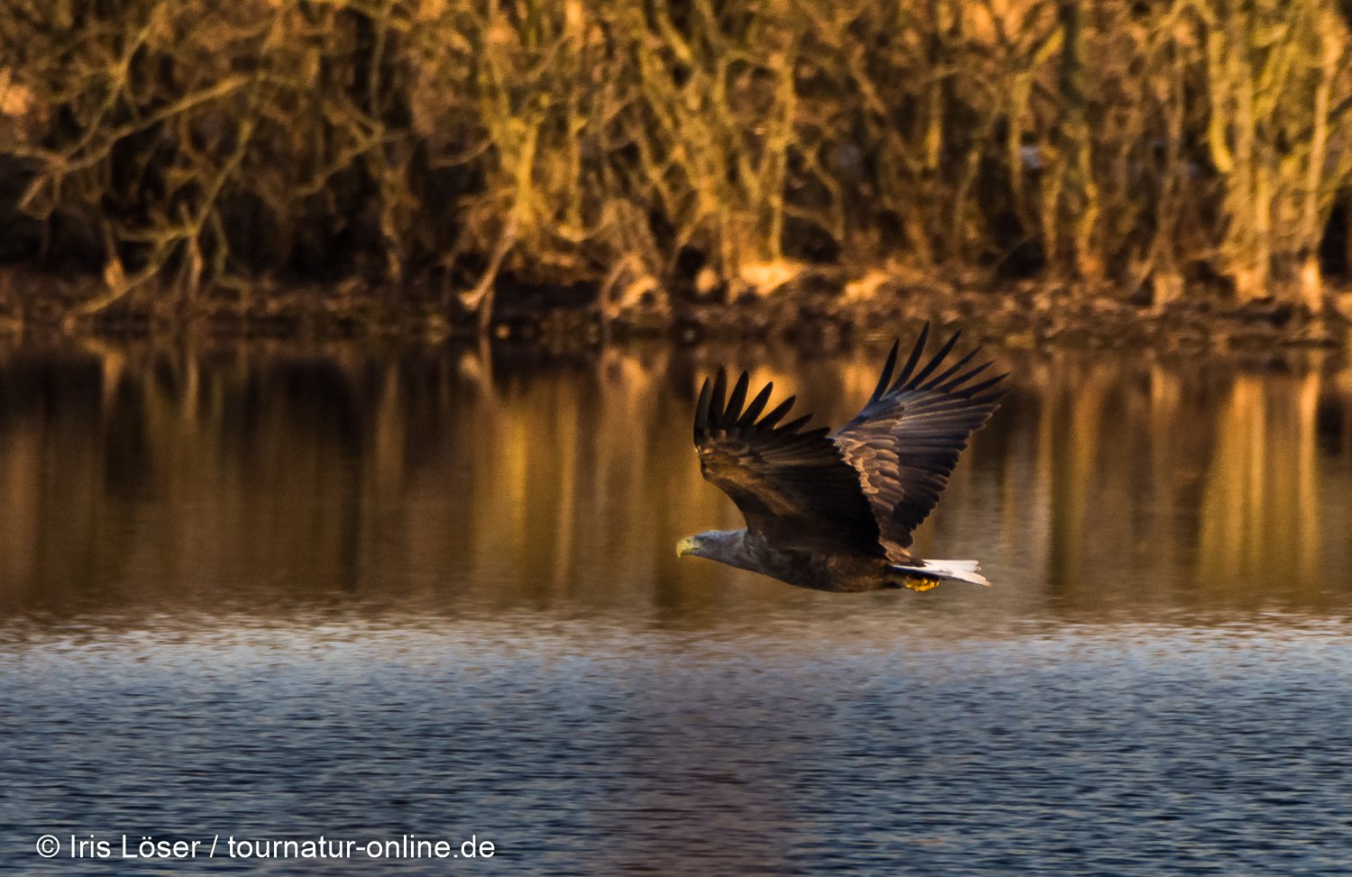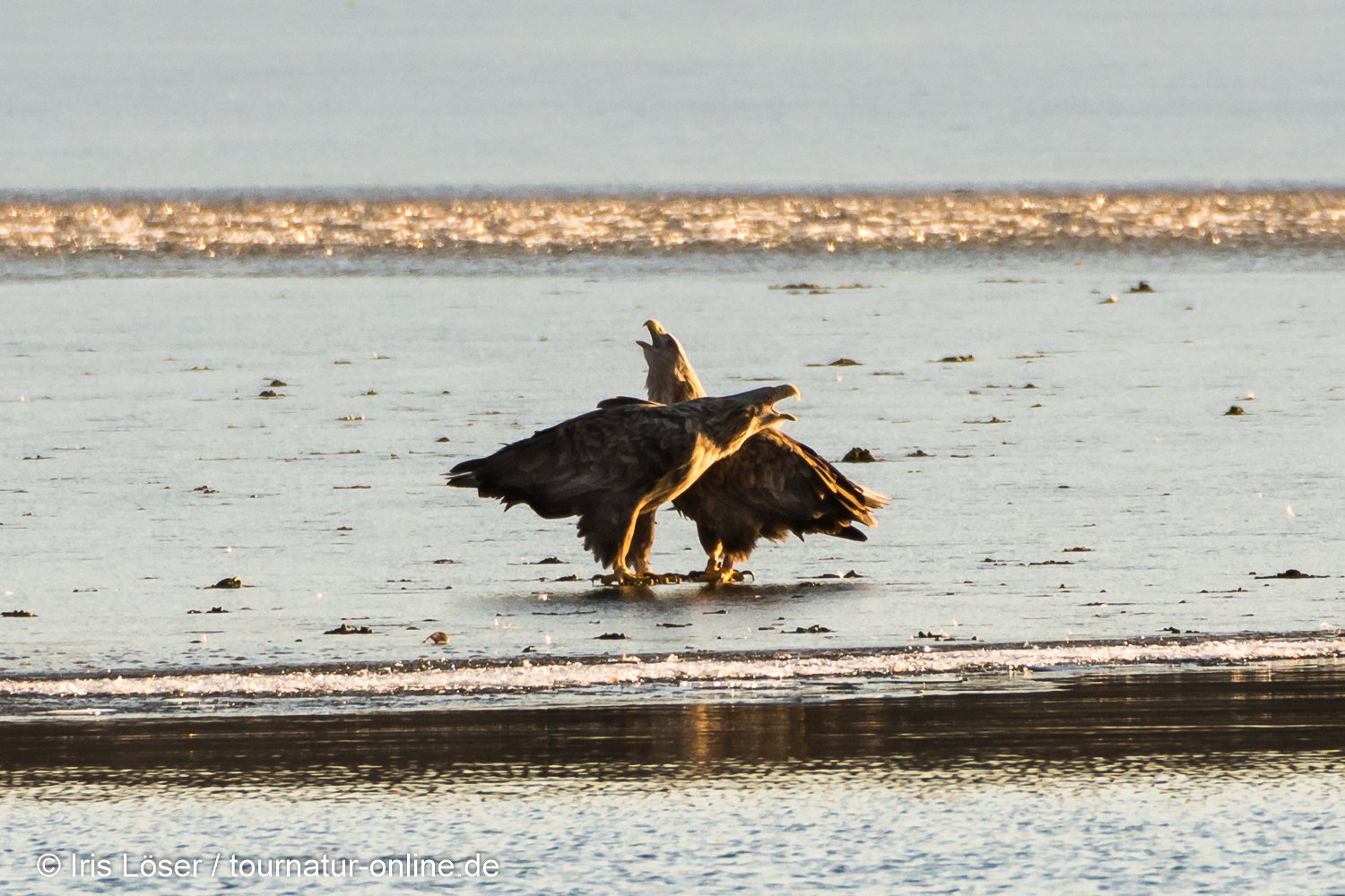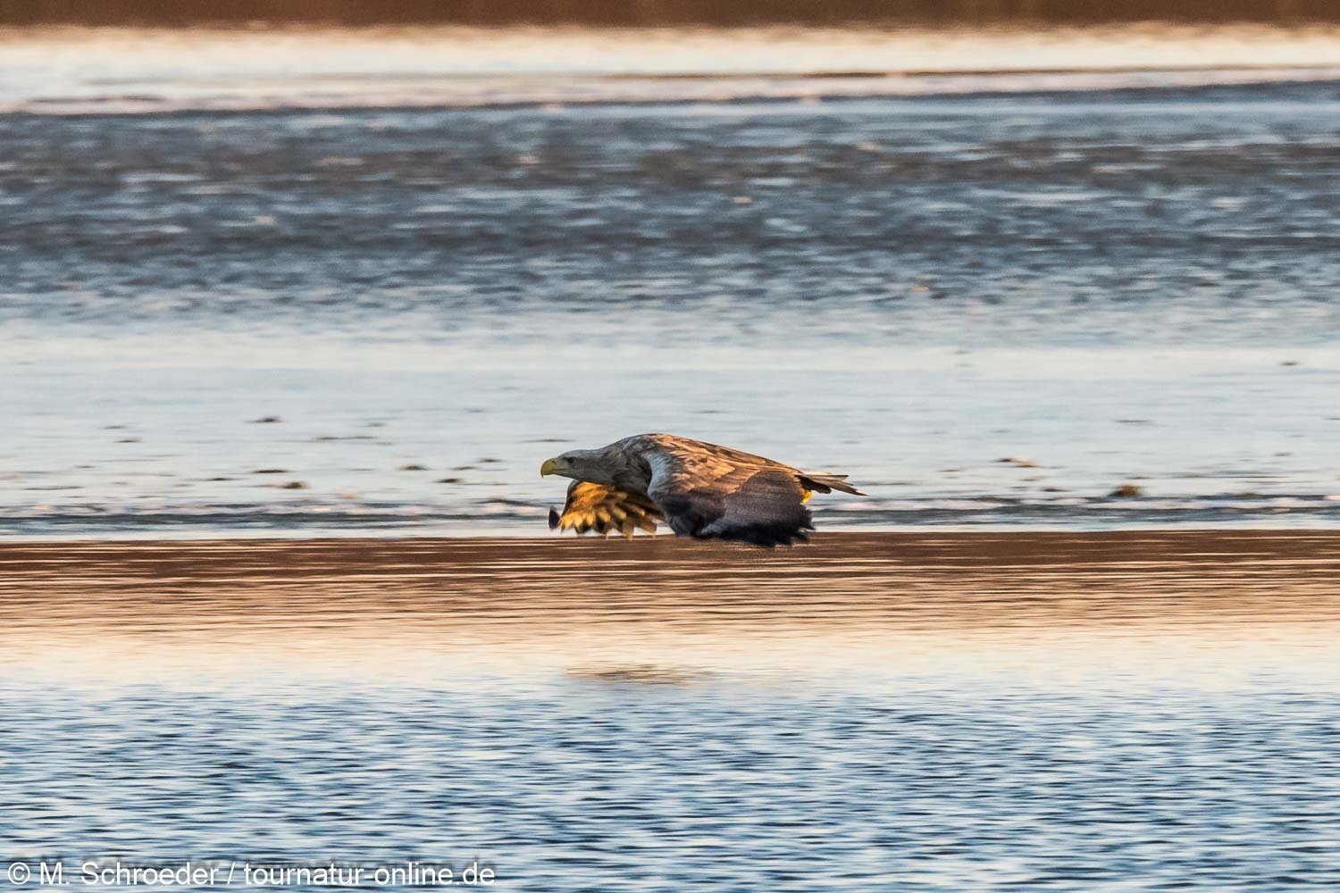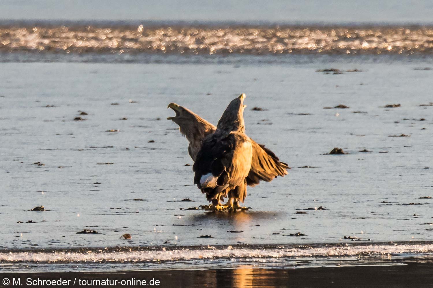Nach kurzer Zeit wissen wir auch warum: Zum Greifen nah stehen hier überwinternde Kranichpaare im seichten Wasser. Auf der Eisfläche des Sees balzen Seeadler umgeben von diversen Entenvögeln.