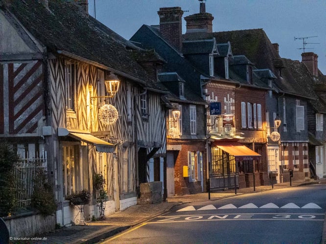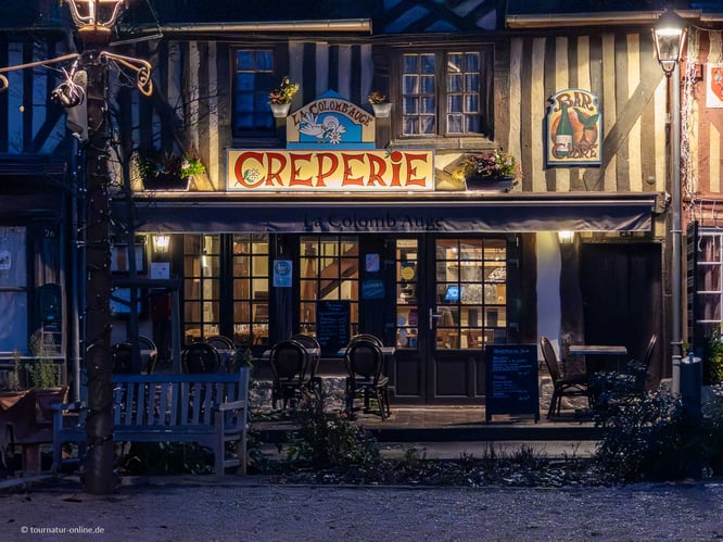 Der kleine Ort Beuvron-en-Auge, nahe des Seebades Cabourg, zählt zu schönsten Dörfer Frankreichs. Im dem Dorf mit seinen nur knapp 200 Einwohern geht es beschaulich zu. Die historischen und aufwendig restaurierten Fachwerkhäuser verbreiten eine Atmosphäre wie aus dem Bildrbuch. Am Wochenenden Feiertagen und in den Ferien zieht es dementsprechend viele Besucher hierher. Wir sind an einen Sonntagabend aber fast alleine unterwegs und genießen in einer Creperie Galettes und Cidre de Normandie.
