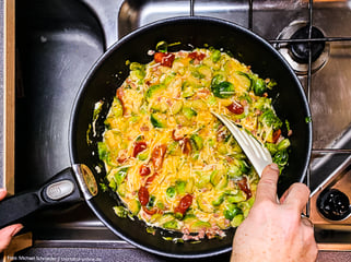 Wir benutzten die beschichtete Form des Omnia. Alternativ kann man das ganze aber auch in der Silikonform zubereiten, da wird das Ganze nach unserer Erfahrung aber nicht so schön knusprig. Eine Zubereitung in der Aluform haben wir noch nicht ausprobiert. Wahrscheinlich benötigt man hier deutlich mehr Öl, damit nichts anbrennt. Wir finden aber den Kontakt von Lebensmitteln mit Aluminium nicht wirklich wünschenswert. Man kann die Kartoffeln, das Gemüse auch auf den Rost legen, den es als Zubehörteil gibt. Dann brennt definitiv nichts an, aber die Stücke fallen gerne durch die Schlitze und das Herausnehmen ist am Ende eine echte Herausforderung.