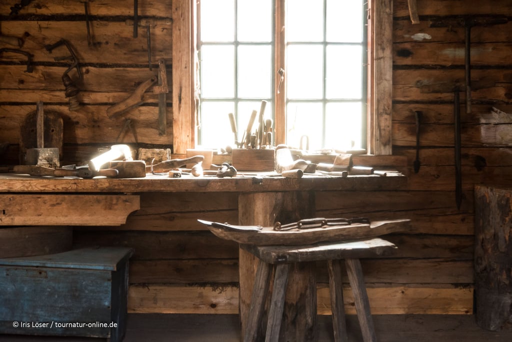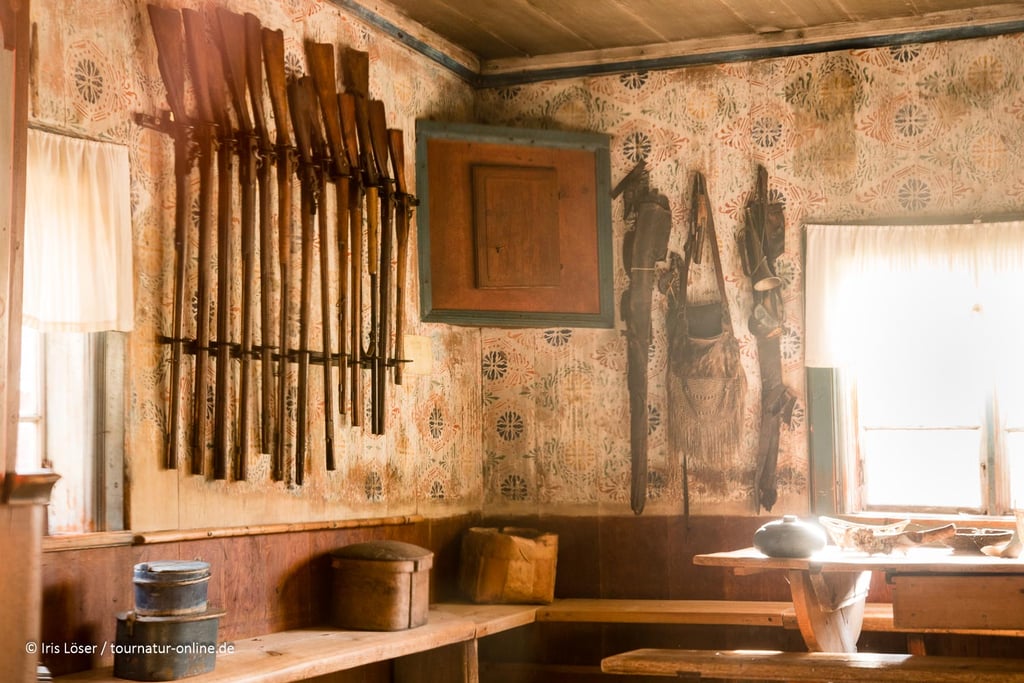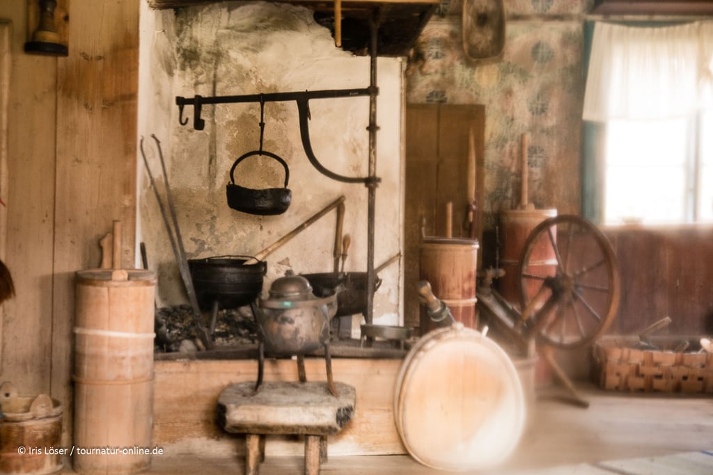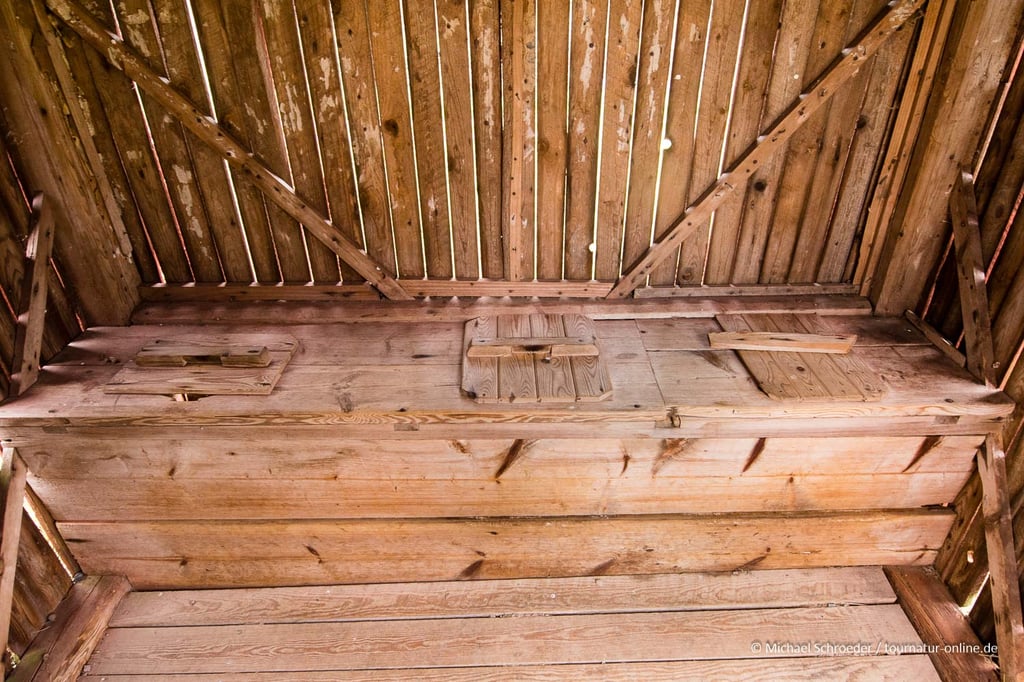 Die ermäßigte Eintrittsgebühr wirft man in einen Kasten am Eingang. Im Sommer können auch die Innenräume besichtigt werden. Wir gucken durch die Scheiben und tatsächlich, im Schuppen stehen tatsächlich die Holzmännchen, die Michel schnitzte, wenn er mal wieder zur Strafe hier drin eingeschlossen wurde.