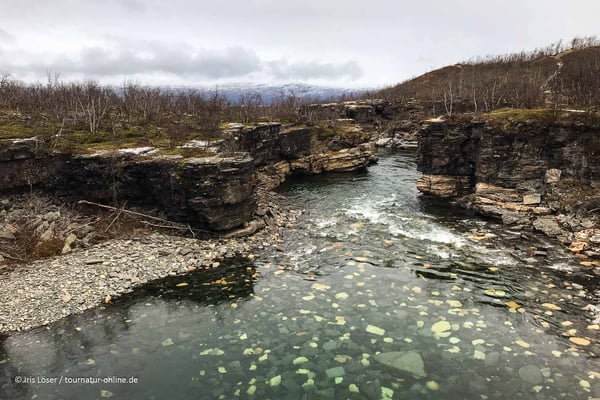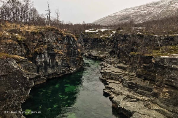Wir erwischen bei unserem Besuch nun gerade einen der seltenen Momente, wenn es sogar keine Chance gibt, Polarlichter zu sehen. Es hat sich eingeschneit und es besteht auch in den nächsten Tagen keine Hoffnung auf Wetterbesserung. So parken wir in der Nähe des Besucherzentrums, das natürlich in dieser Zwischensaison wie so vieles andere geschlossen ist, und machen eine kurze Wanderung entlang des Flusses Abiskojåkka der hier in den See Torneträsk mündet.