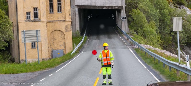 Heute leitet uns sogar ein Pilotfahrzeug an einer Baustellle im Tunnel vorbei. Nicht nur, dass auf halbem Weg im Tunnel mit grossem Gerät gearbeitet wird, die Tunnelbeleuchtung ist noch dazu ausser Betrieb. Wir fühlen uns wie hinter dem Safety Car bei der Formel 1, nur dass die Strecke durch ein im wahrsten Sinne des Wortes "schwarzes Loch" führt.