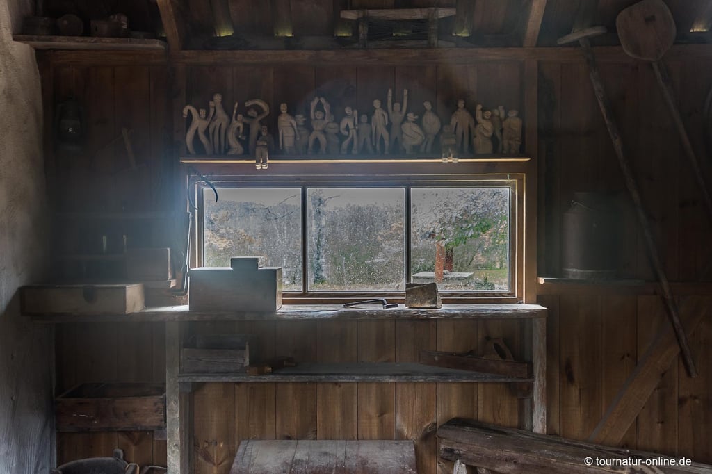Die ermäßigte Eintrittsgebühr wirft man in einen Kasten am Eingang. Im Sommer können auch die Innenräume besichtigt werden. Wir gucken durch die Scheiben und tatsächlich, im Schuppen stehen tatsächlich die Holzmännchen, die Michel schnitzte, wenn er mal wieder zur Strafe hier drin eingeschlossen wurde.