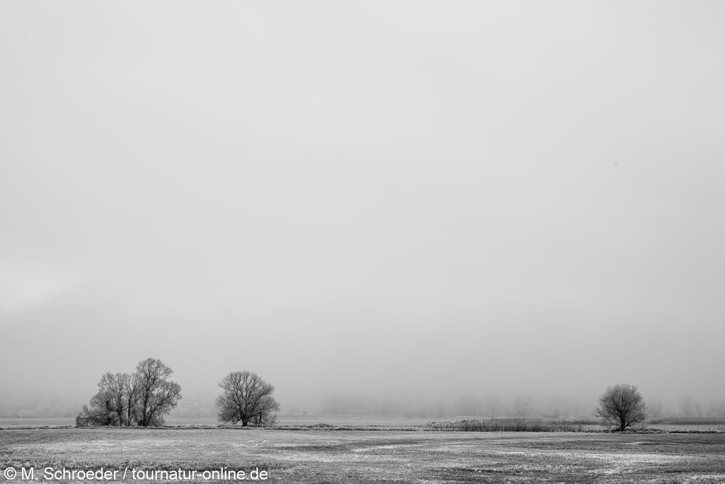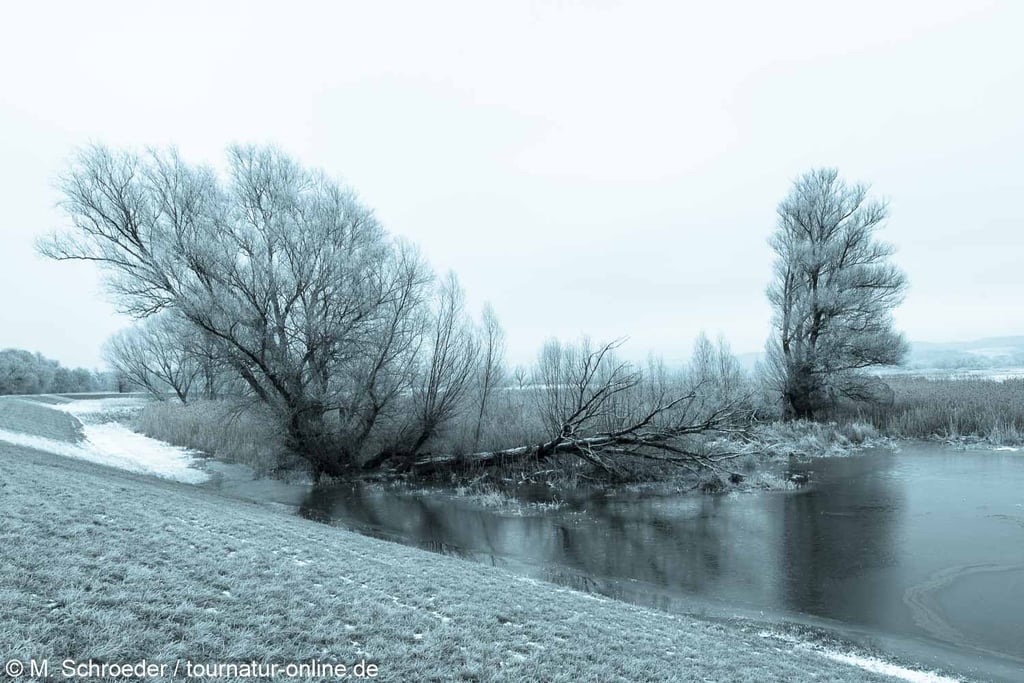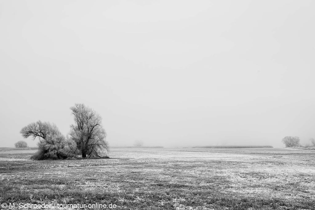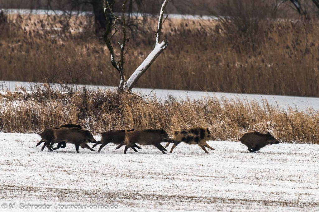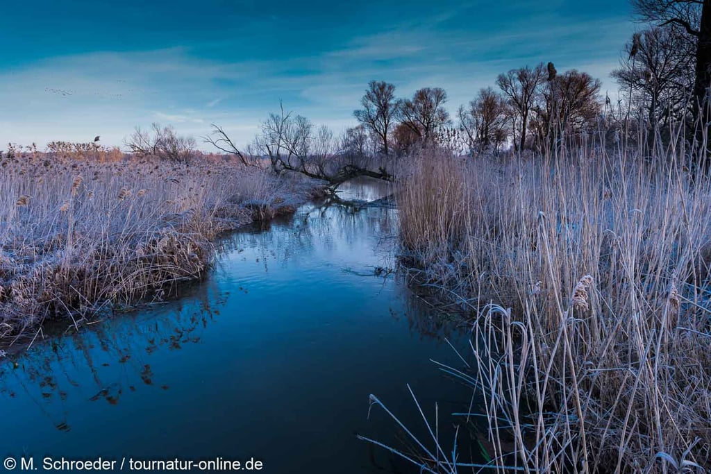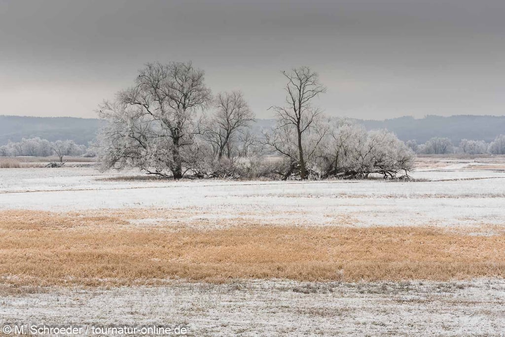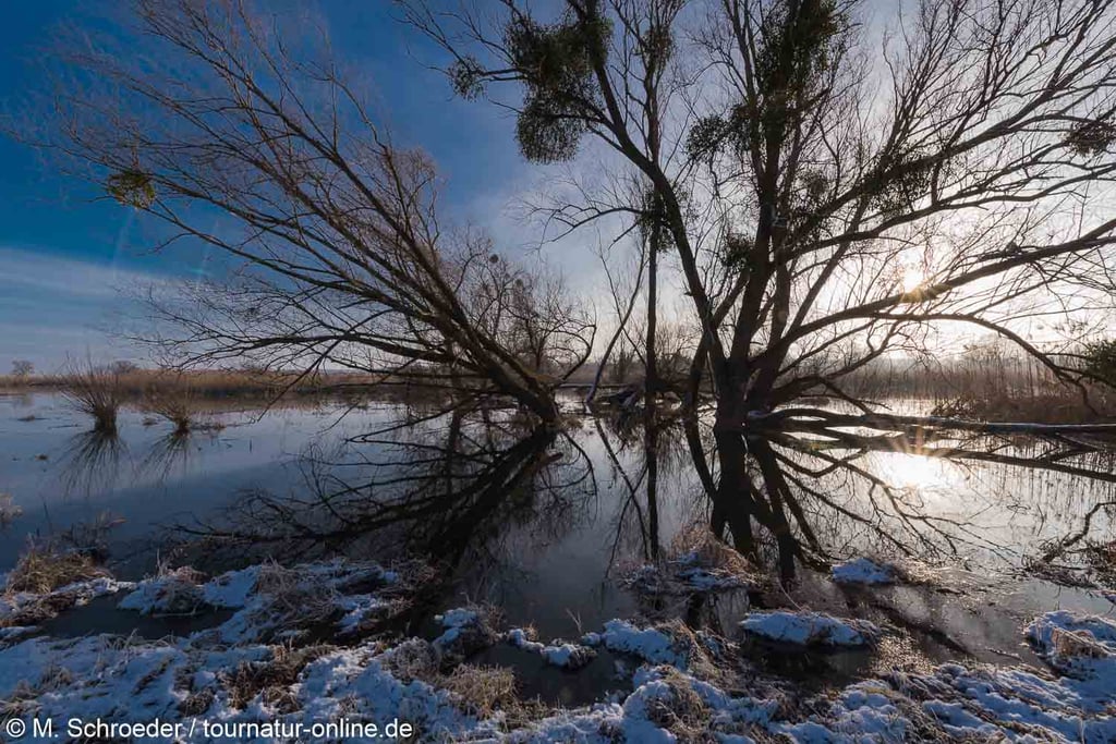 Am nächsten Morgen machen wir uns zu Sonnenaufgang auf eigene Faust erneut auf den Weg durch die beeindruckende Landschaft entlang der Oder. Diese weist jetzt im Winter überzogen von Raureif einen besonderen Reiz auf und entschädigt uns für die etlichen Minusgrade im Januar. Ein Ranger gibt uns unterwegs Tipps für besonders gute Beobachtungspunkte und so sehen wir neben Singschwänen auch diverse Entenarten und Greifvögel, darunter Seeadler und eine Kornweihe, Wildschweine, Rehe, Füchse und ganz kurz einen Biber.