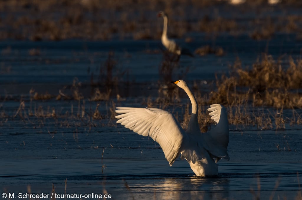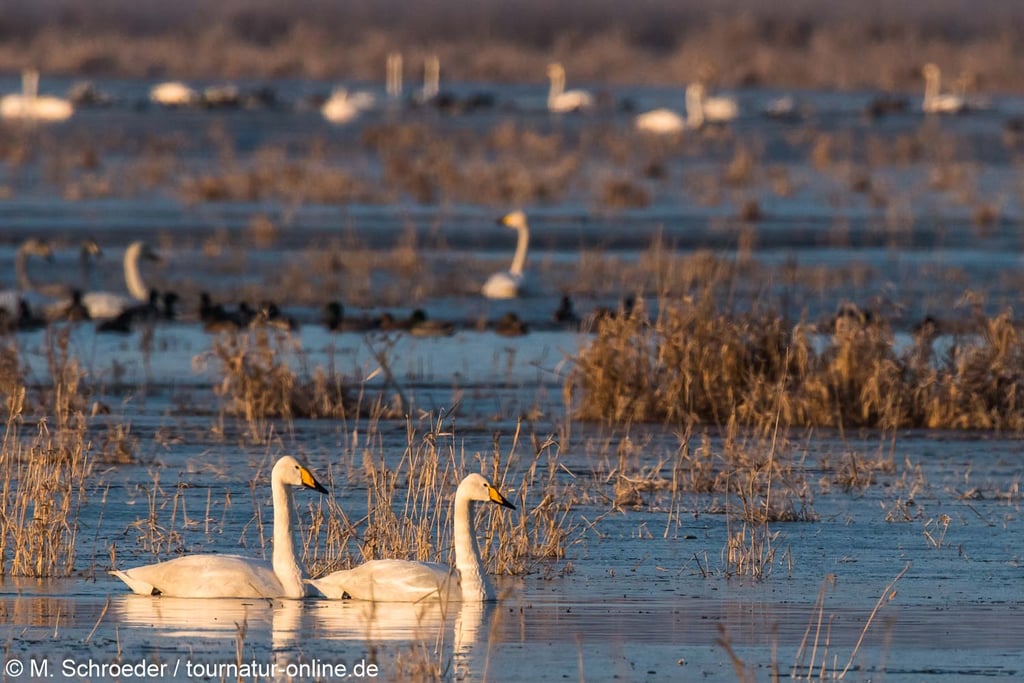 Im Anschluss an den Einführungsvortag von Nationalparkmitarbeiter Tim Bornholt nehmen wir an einer vom Nationalparkleiter Dirk Treichel geführten Wanderung zu den Schlafplätzen der Singschwäne teil. Schon aus der Ferne hört man im Dunkeln die trompentenartigen Rufe, die den Vögeln ihren Namen geben.