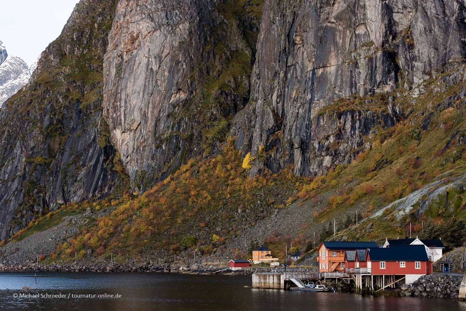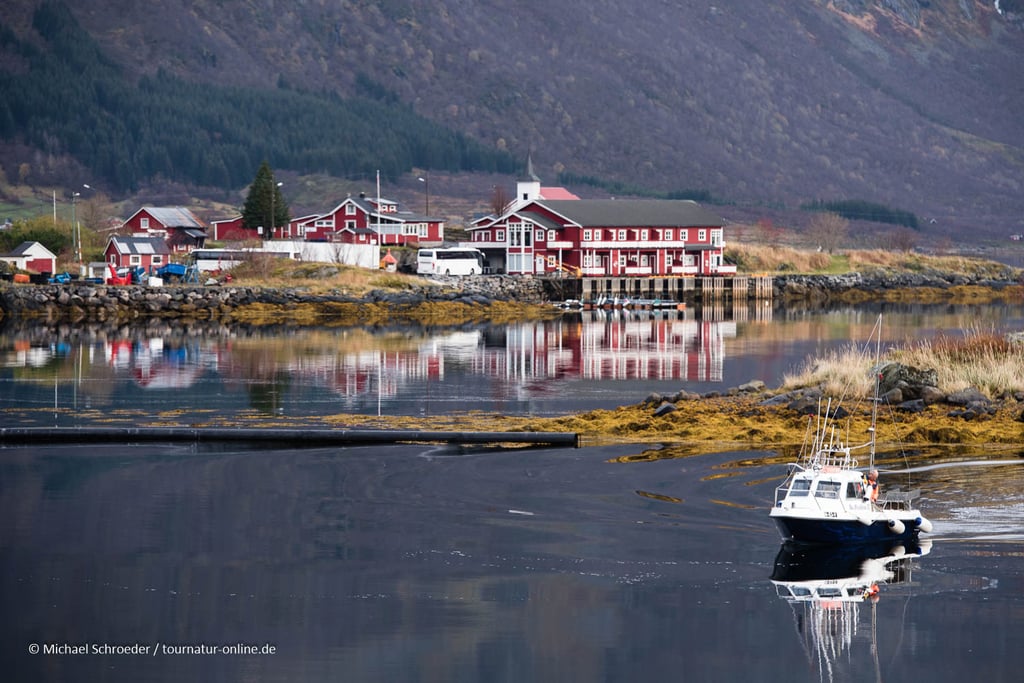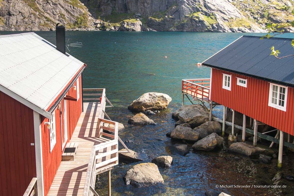 Das kleine Fischerdorf Hamnøy liegt nur etwa 1,5 Kilometer nord-östlich von Reine auf der Insel Moskenesøya und ist über die Hauptstraße E10 zu erreichen. Der Ort selbst ist wenig aufregend. Die roten Fischerhütten des Resort Eliassen Rorbuer sind aber einer der am häufigsten fotografierten Spots der Lofoten und ein echtes Postkartenmotiv. Auch Drohnen-Fotografen kommen hier auf ihre Kosten. Aber Vorsicht: Es kann hier sehr windig sein.