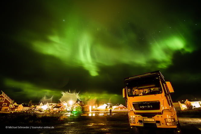Unser Besuch im Oktober gilt auch eher dem Polarlicht. Und tatsächlich, wir haben das Glück, dass direkt über dem zentralen Parkplatz am Hafen das Polarlicht für uns eine beeindruckende Inszenierung startet.