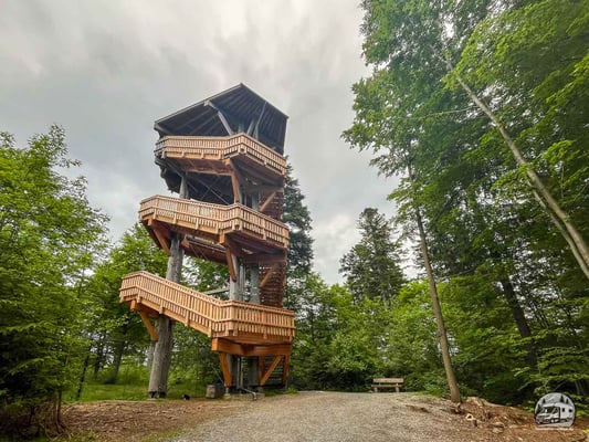 heimisch waren. Vom frisch sanierten Aussichtsturm haben wir einen guten Blick ins Wolfsgehege. Leider ist vom Wolfsrudel weit und breit nichts zu sehen, die Aussicht von oben lohnt aber den