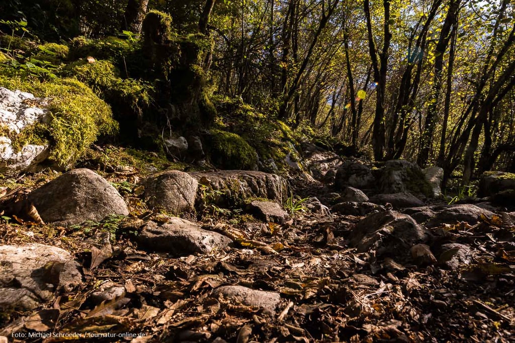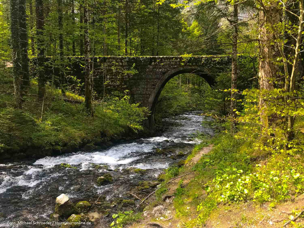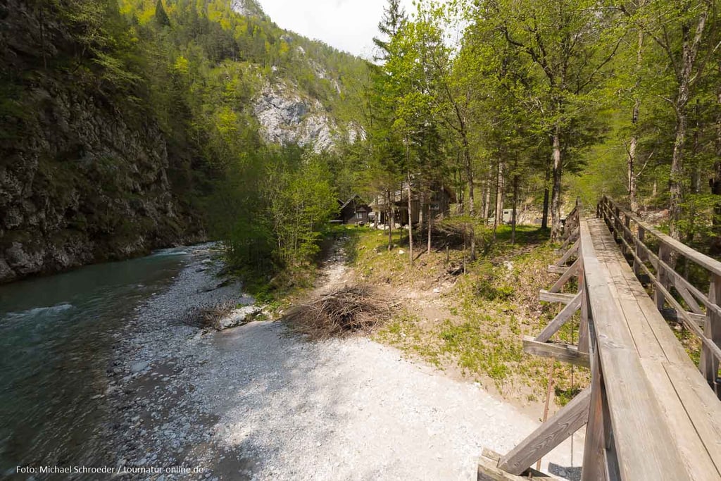Der Weg führt nun entlang des Flüsschens Radovna mit seinem kristallklaren Wasser vorbei an einer ausgeschilderten alten wassergetriebenen Säge und Mühle sowie einer im zweiten Weltkrieg durch die deutsche Wehrmacht auf der Suche nach Widerstandskämpfern niedergebrannten Siedlung. Die Einwohner fanden in den Flammen den Tod. Die Geschichte dieses Ortes ist bedrückend, das Tal selbst aber wunderschön und wir nehmen uns daher die Zeit für den ein oder anderen Fotostopp.