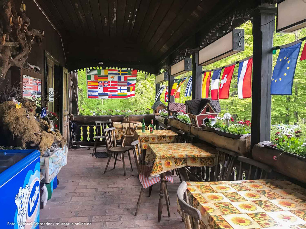 Hinter dem großen Namen verbirgt sich ein beliebtes Ausflugslokal mit großen Wiesenflächen, an dem an Wochenenden und zu Feiertagen wohl ab und an "der Bär steppt." Jetzt unter der Woche ist aber rein gar nichts los. Wir sind die einzigen Gäste des kauzigen aber sehr freundlichen Betreibers und dürfen uns auf dem riesigen Gelände einen Platz frei wählen.