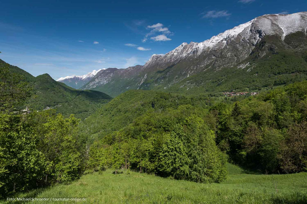 Ist das Tal der Soca im Oberlauf eng und hat tiefe Schluchten in den Fels gegraben, in denen das Wasser wirbelt und bei Sportlern eine beliebte Wildwasserstrecke ist, wird das Tal Richtung Süden nun breiter und weiter. Die Soca wird zu einem Fluß.