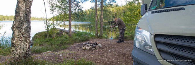 Wir hatten im Vorfeld gelesen, dass die Sicherheitslage entlang der Autobahn E6 in Norwegen und Schweden nicht so prickelnd sein soll. Dies scheint sich leider auch auf einen Korridor von einigen Kilometern neben der Autobahn zu erstrecken und passt so überhaupt nicht zu unseren bisherigen Erfahrungen auf dieser Reise. Wir fühlen uns hier nicht wohl und fahren daher wieder ins Landesinnere und dort weiter nach Schweden. Unser Ziel ist das Naturreservat Hörnborga-See. Als wir auf dem Parkplatz des dortigen Besucherzentrums ankommen und den wunderschönen See, den aufgeräumten Parkplatz und einige Kollegen von der "weißen Flotto" sehen, atmen wir durch. Hier gefällt es uns doch gleich viel besser.